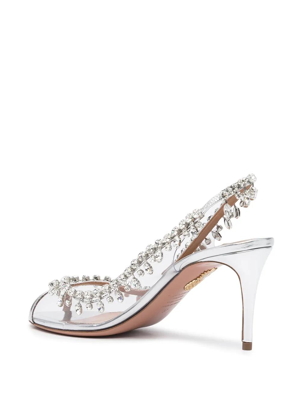 silver-tone leather crystal embellishment open toe slip-on style slingback strap low heel