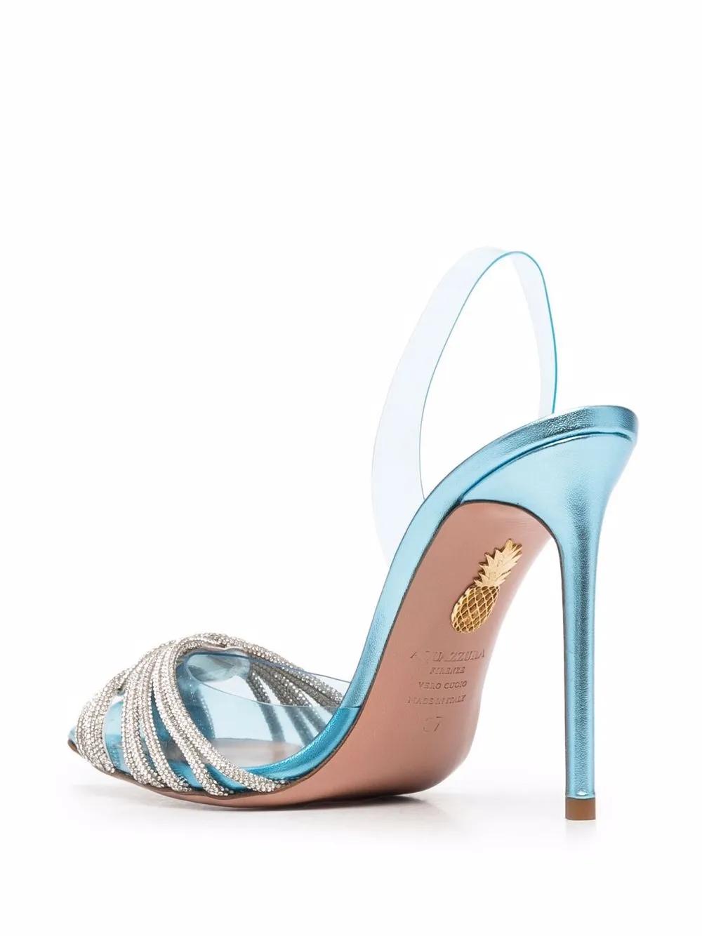 ice blue leather slip-on style transparent design rhinestone embellishment pointed toe slingback strap branded leather insole high stiletto heel leather sole signature pineapple motif
