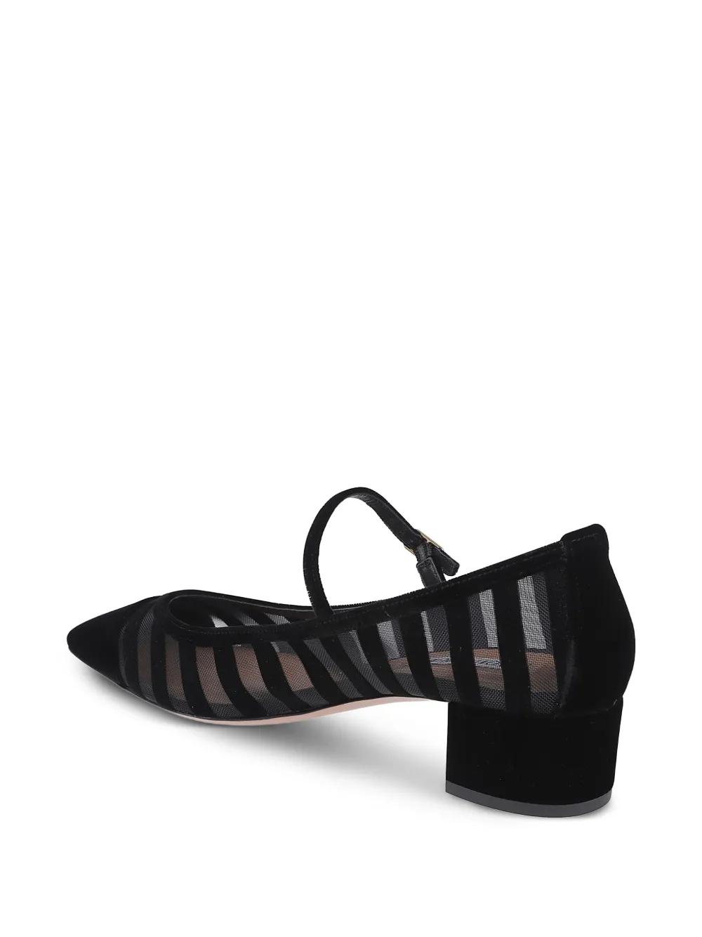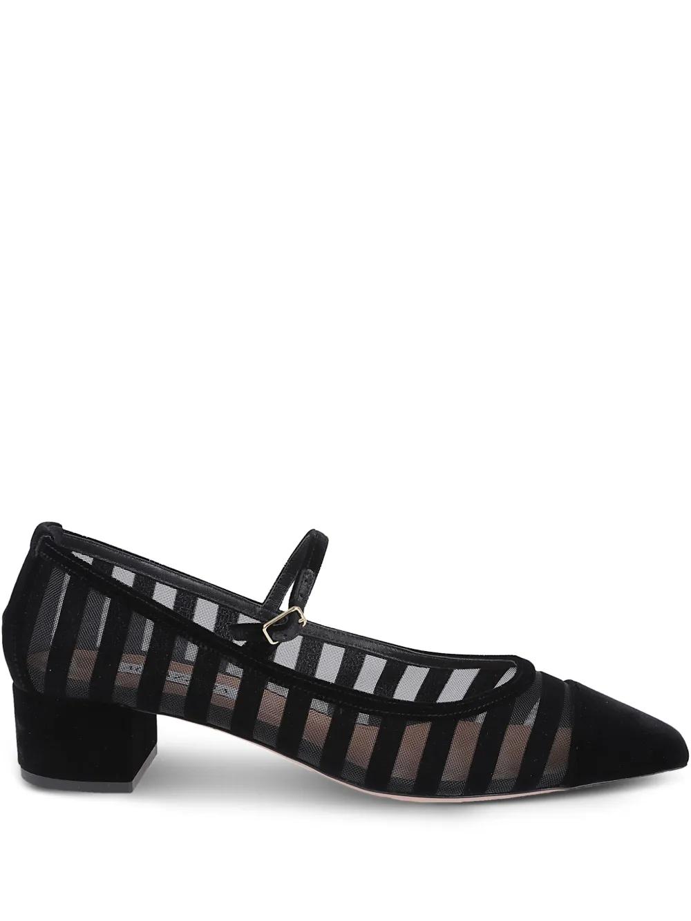black striped mesh upper point toe block heel buckle fastening