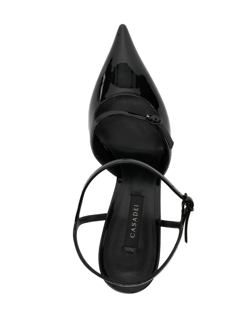 black calf leather patent finish cut-out detailing buckle fastening buckle-fastening ankle strap pointed flat collar branded leather insole high sculpted heel