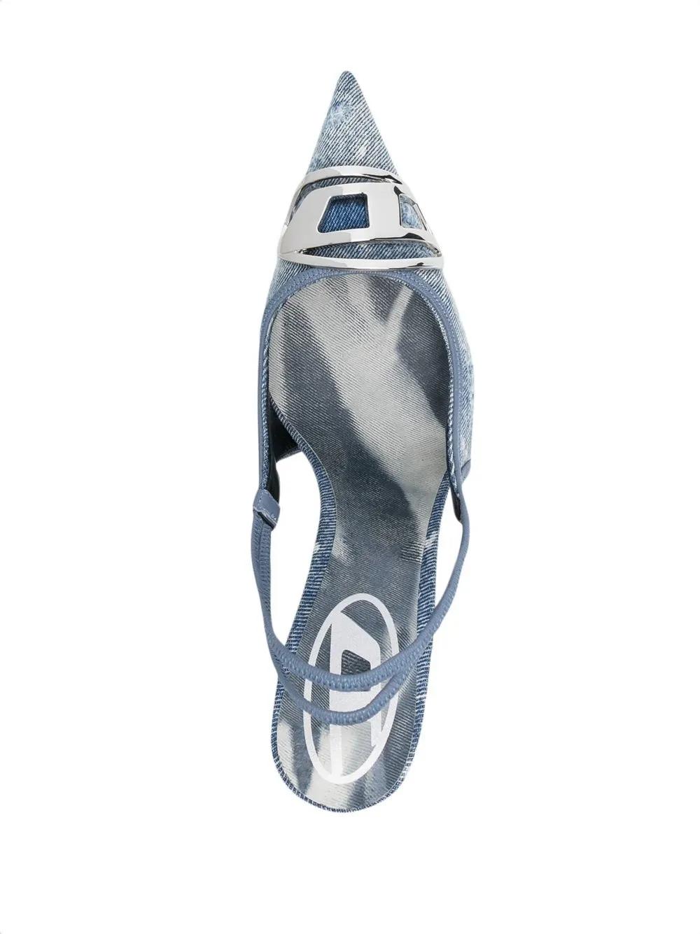 indigo blue cotton oversized signature D logo buckle detail at the toe distressed finish pointed toe stiletto heel elasticated slingback strap