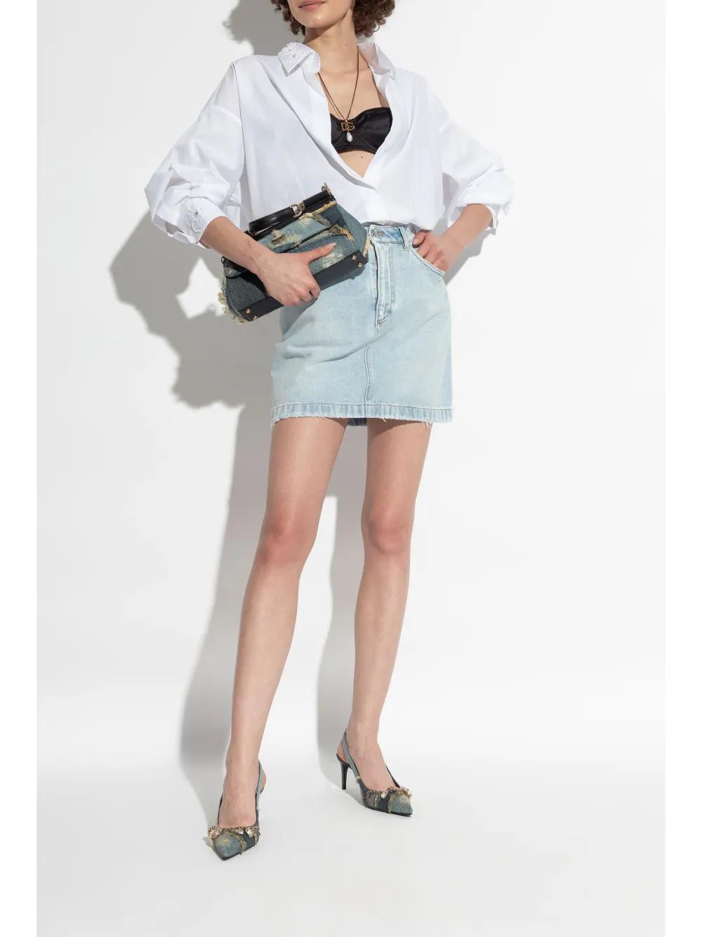 light blue cotton denim distressed finish charm detail chain-link detailing mid heel slingback strap branded leather insole pointed toe