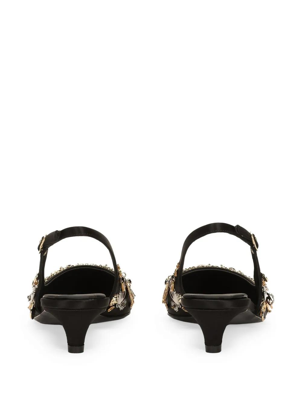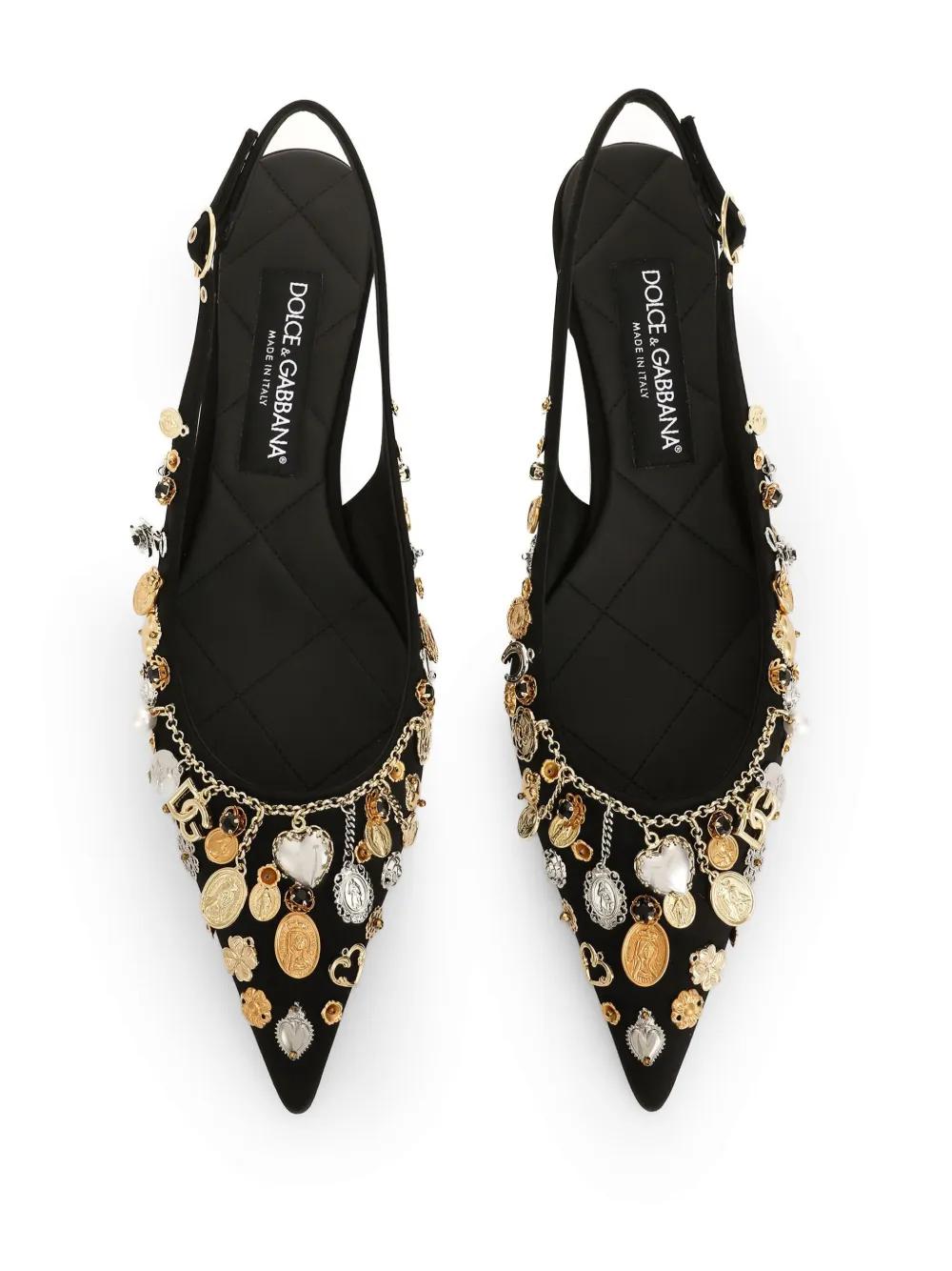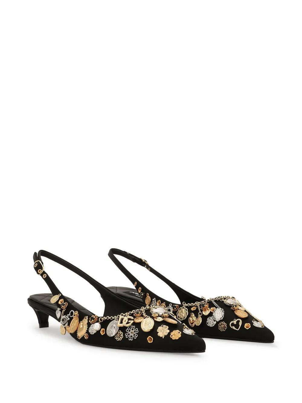 black/gold charm detail chain-link detailing pointed toe slingback strap kitten heel