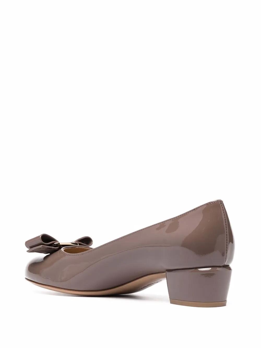 taupe brown calf leather patent finish signature Vara bow detail almond toe branded leather footbed 30mm low stacked heel leather outsole slip-on style