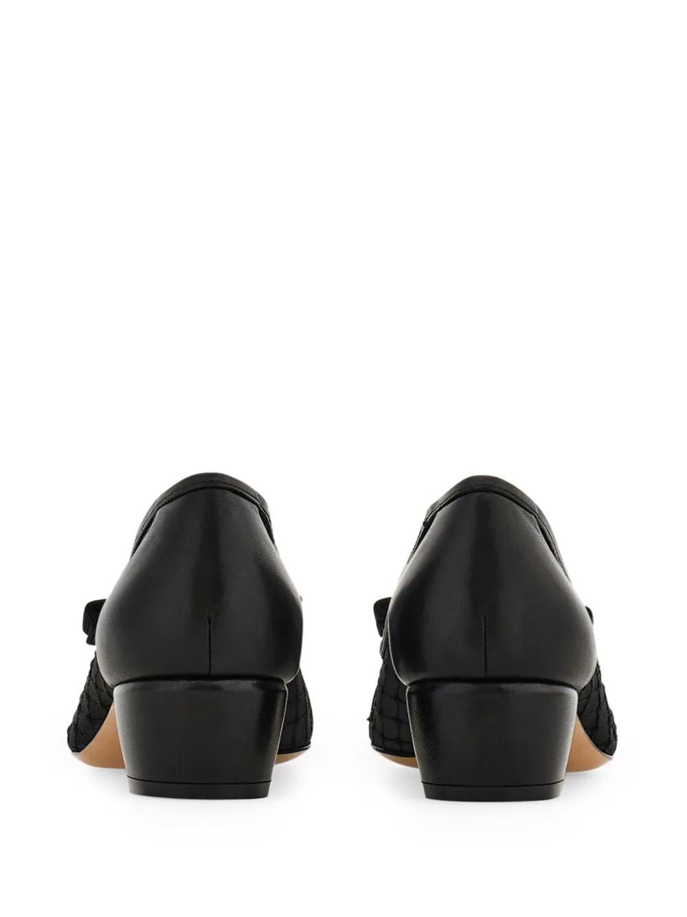 black 30mm low block heel diamond-pattern semi-sheer panels decorative plaque bow detailing almond toe branded leather insole leather sole