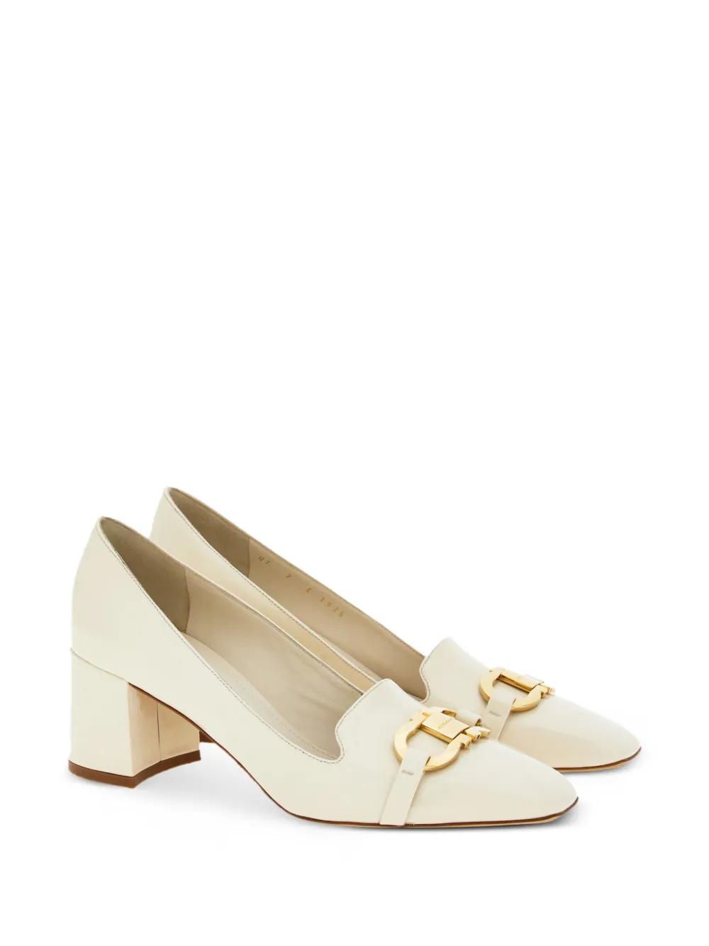 cream white calf leather Gancini plaque gold-tone hardware square toe slip-on style branded leather insole mid block heel