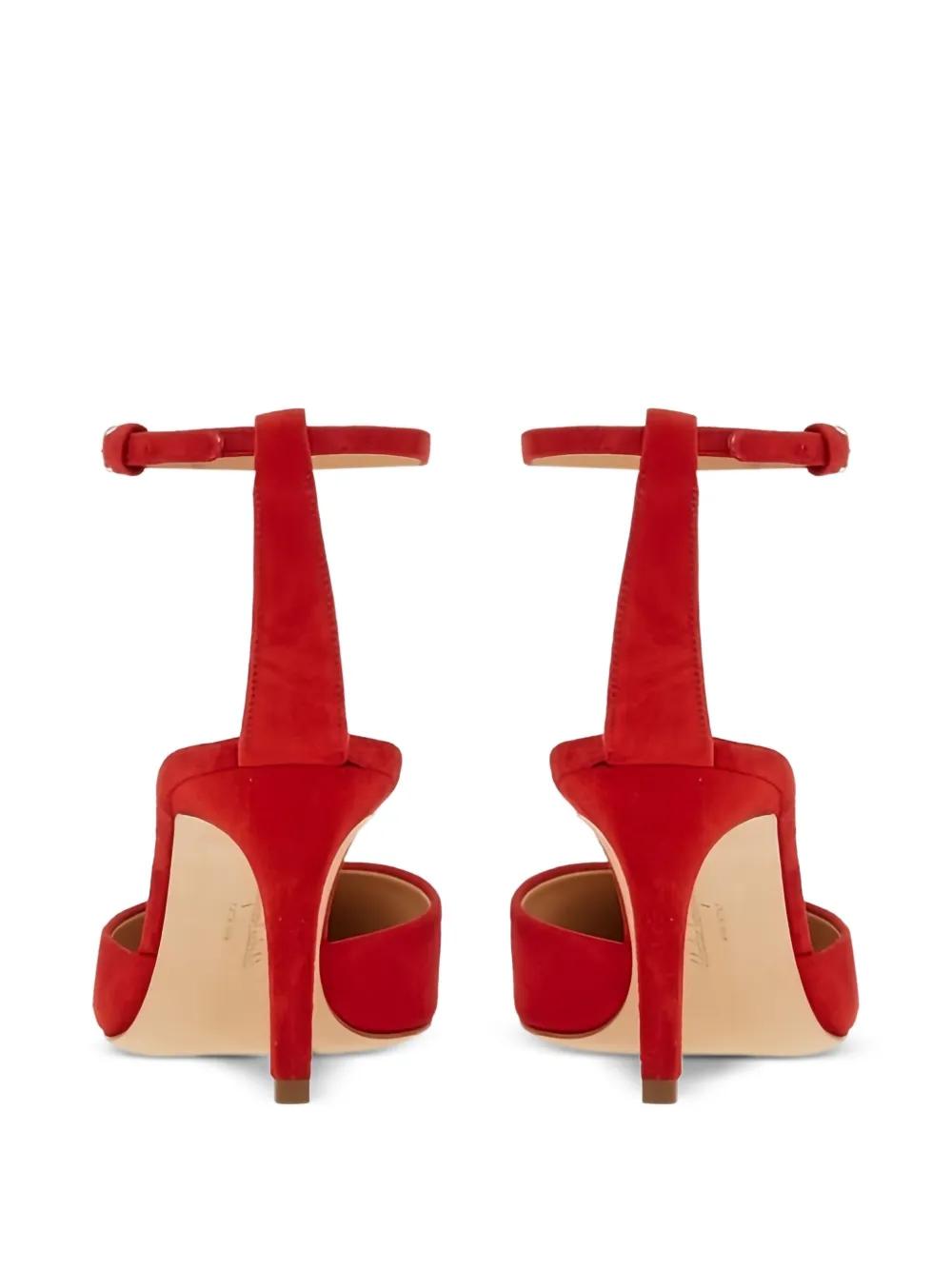red buckle-fastening ankle strap pointed toe mid heel branded footbed bow embellishment