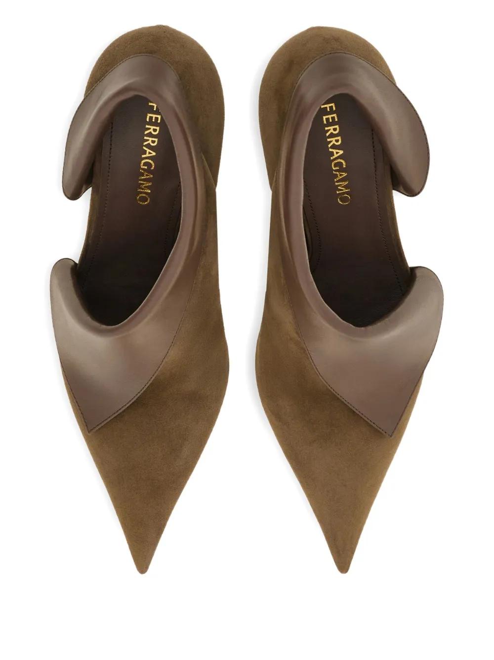olive brown suede overlapping flap design slanted stiletto heel slip-on style