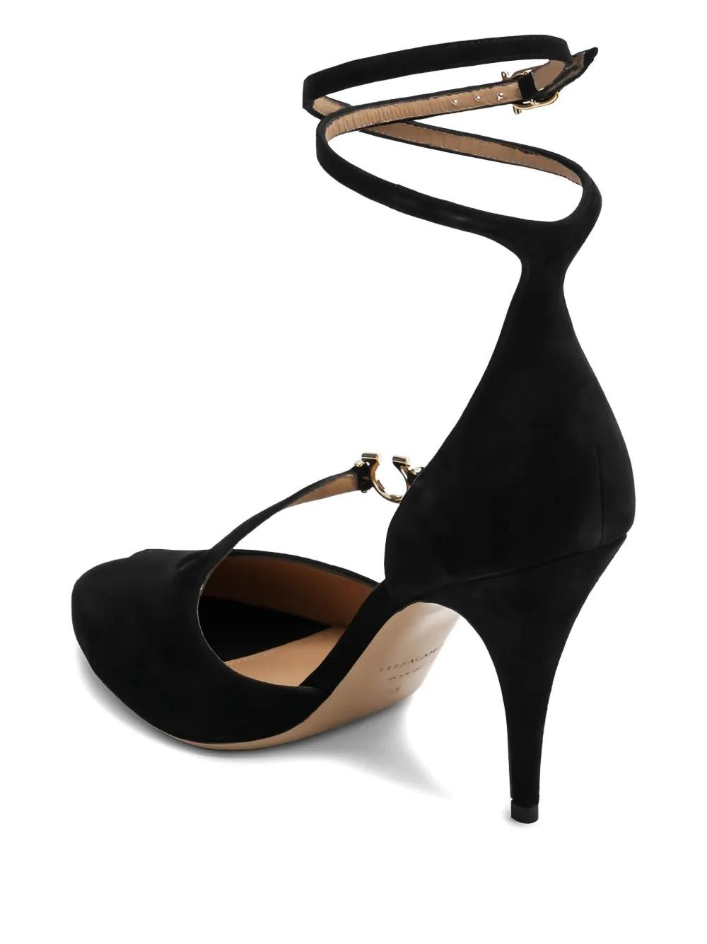 black suede upper gold-tone buckle stiletto heel peep toe ankle-wrap strap