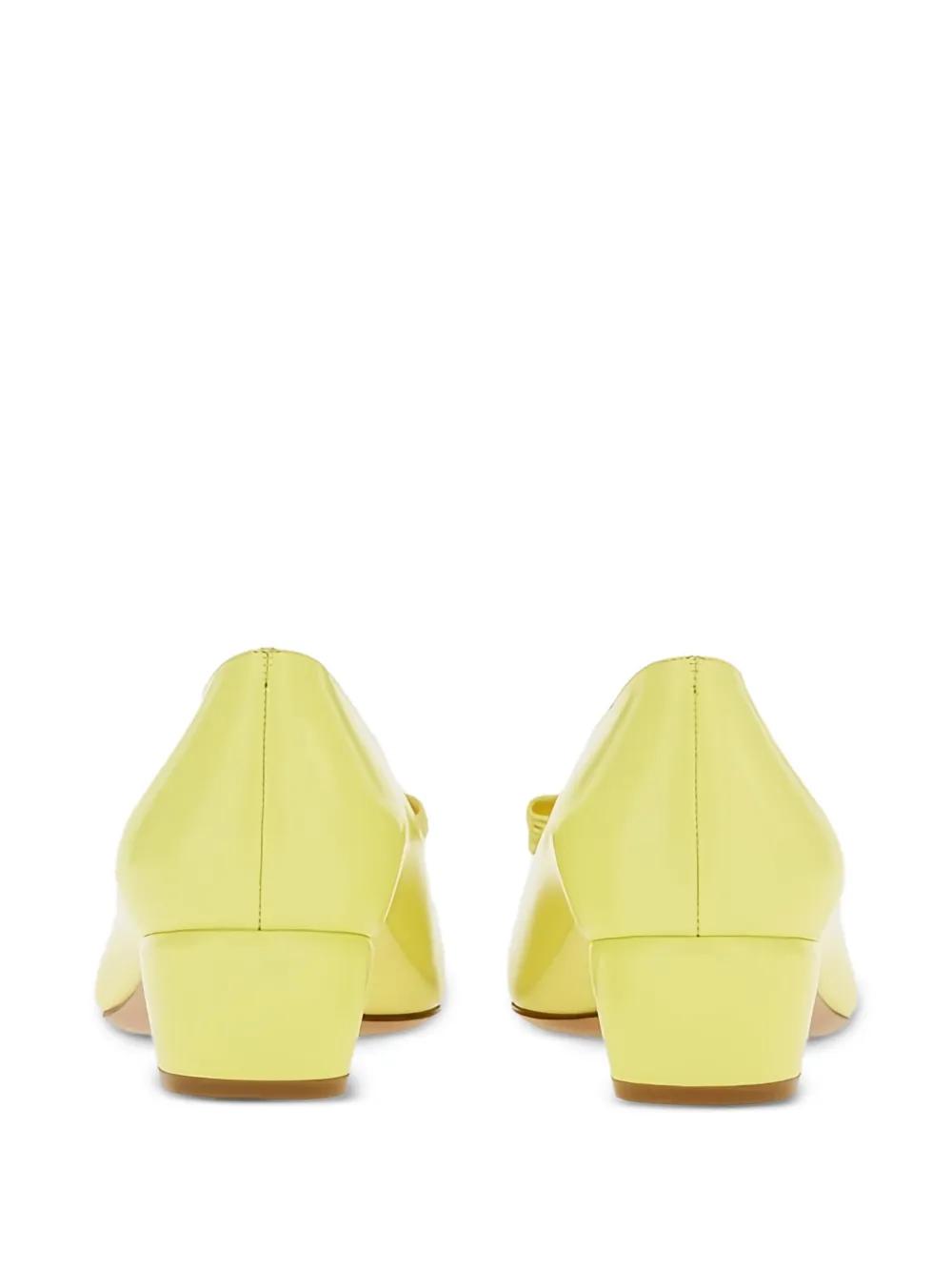 yellow round toe block heel branded footbed bow embellishment gold-tone hardware