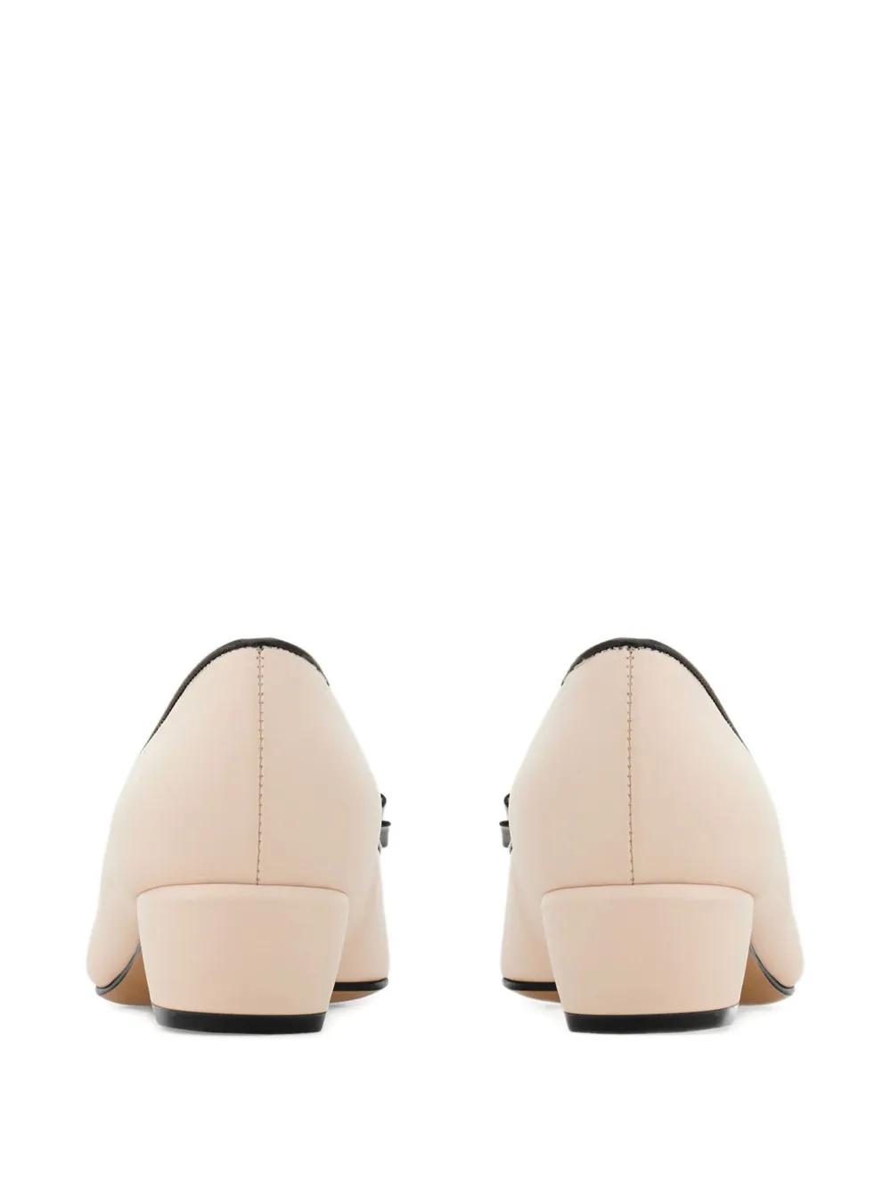 beige slip-on style almond toe low block heel bow detailing