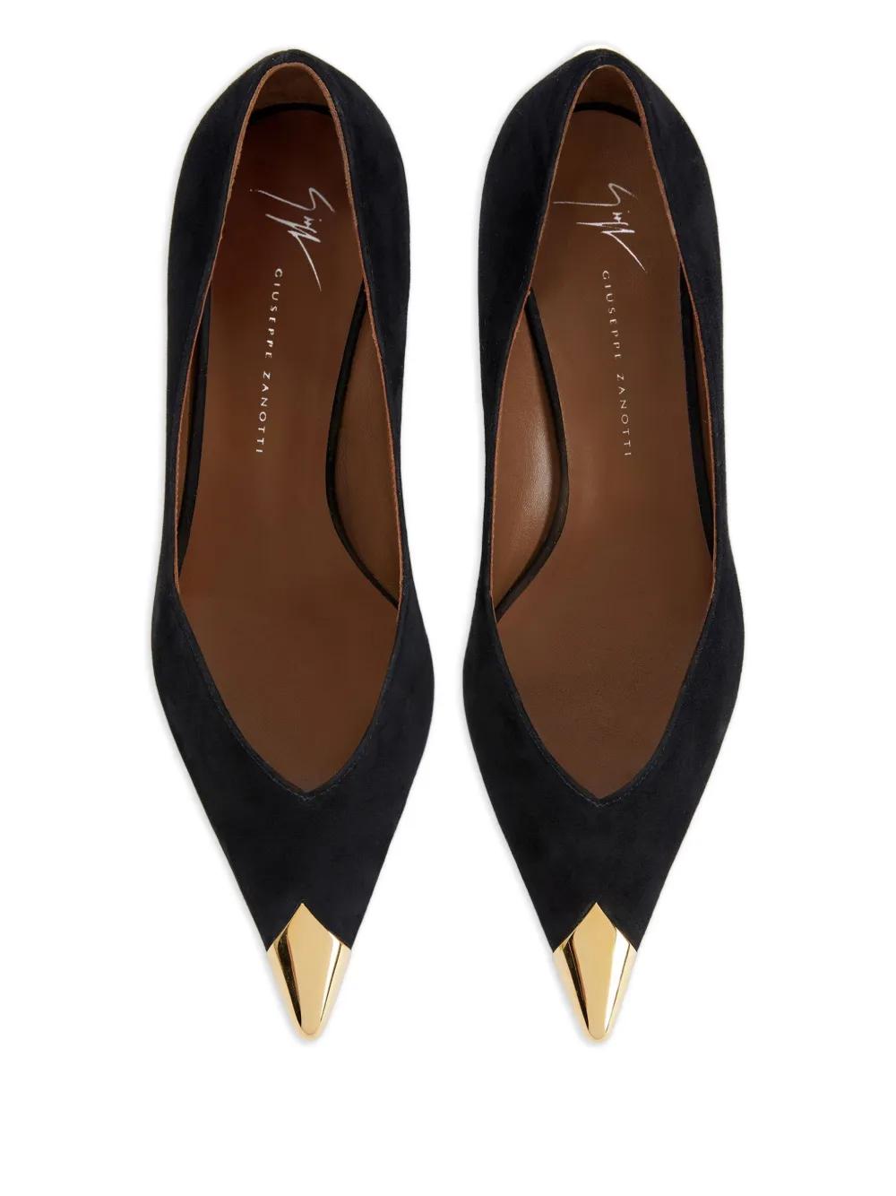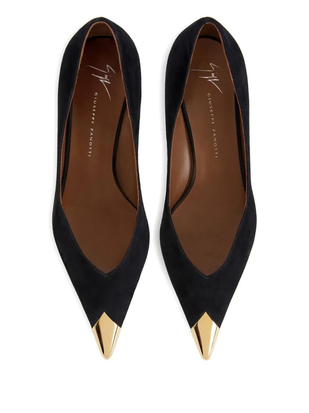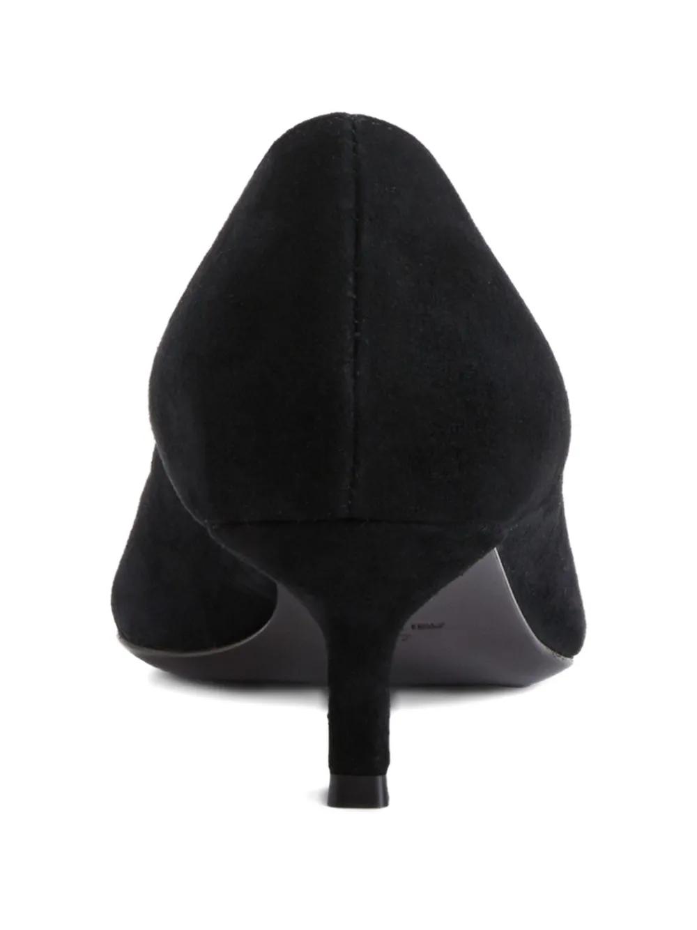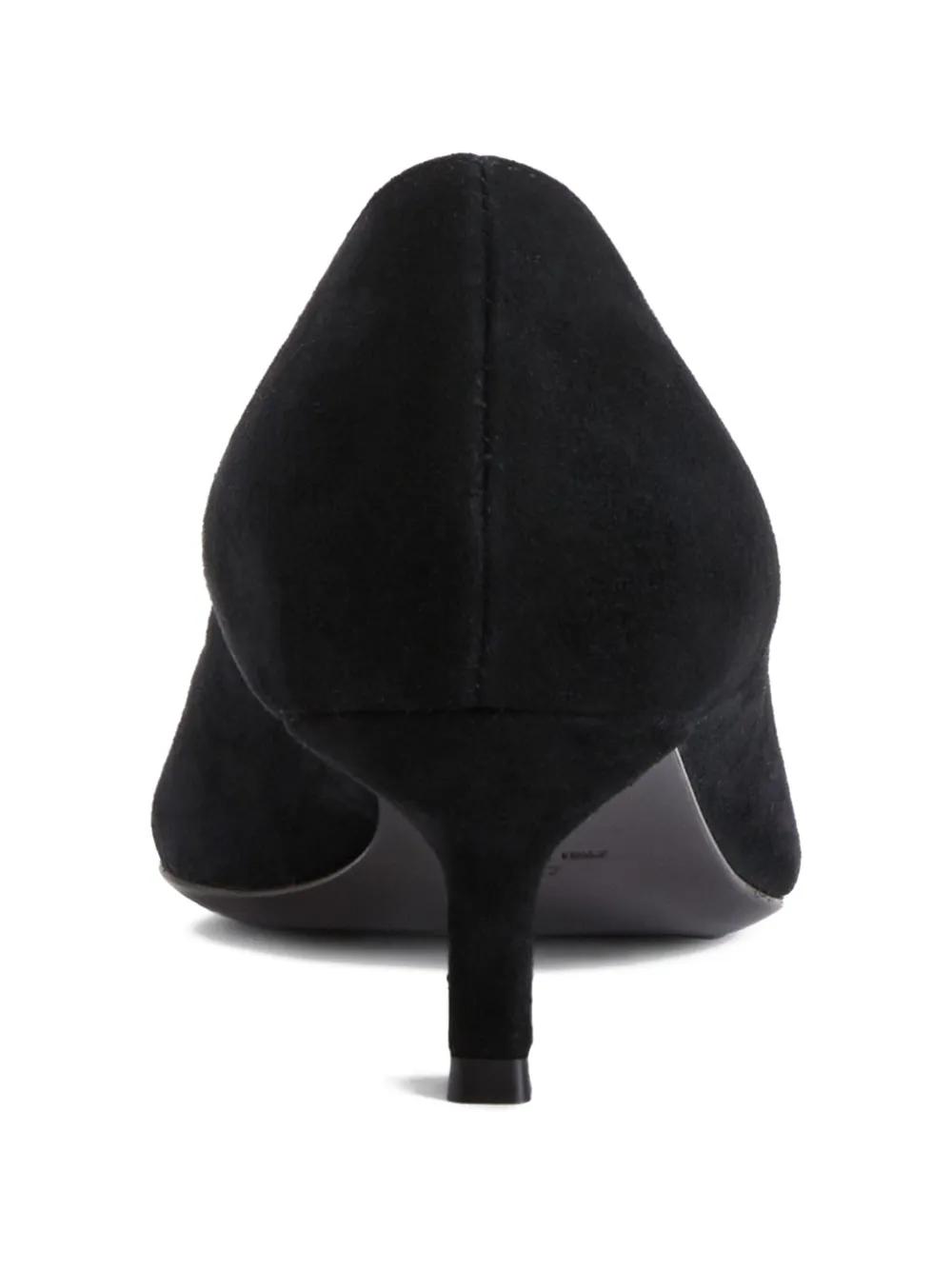 black suede pointed topline kitten heel gold-tone metal toe detail