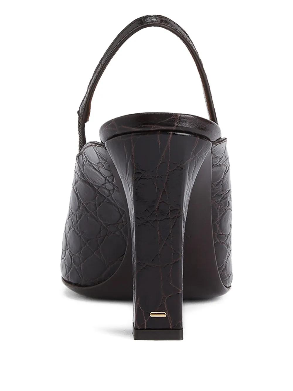 brown crocodile-effect leather slingback strap almond toe block heel leather sole