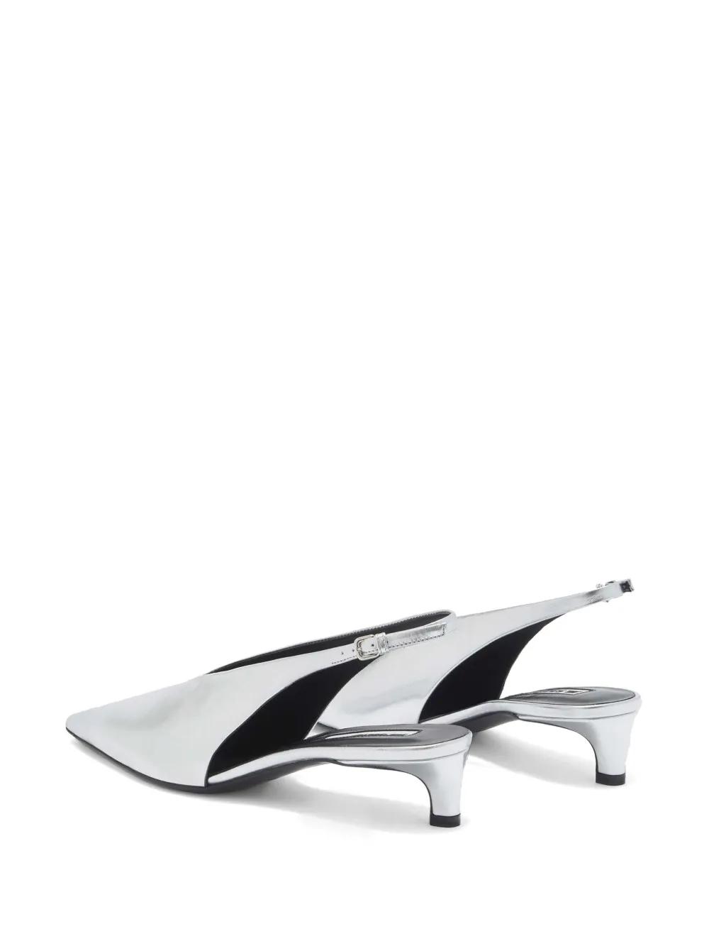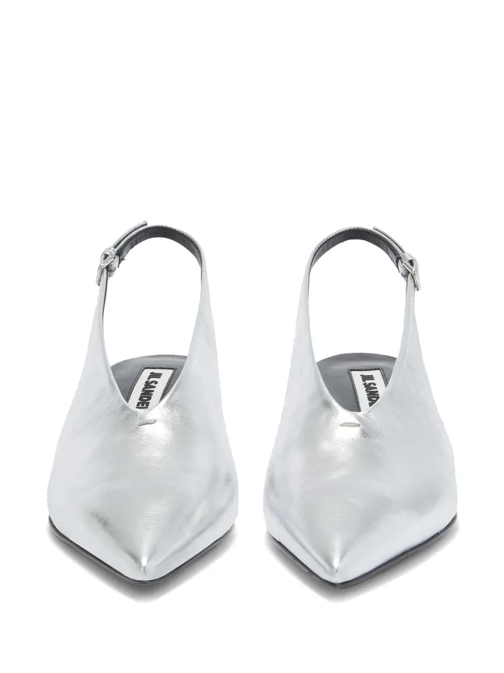 silver-tone calf leather metallic finish pointed toe buckle-fastening slingback strap branded heel counter kitten heel