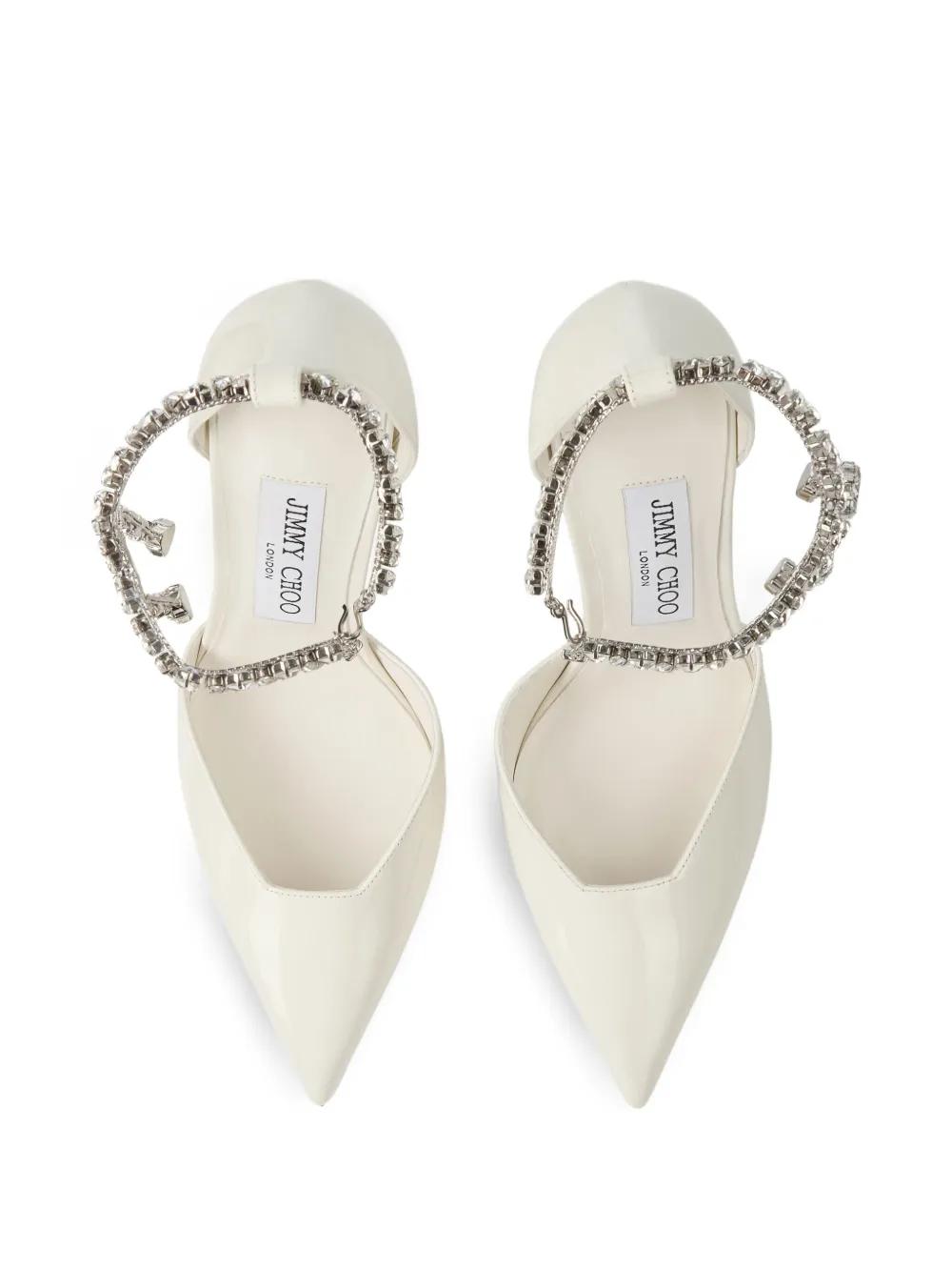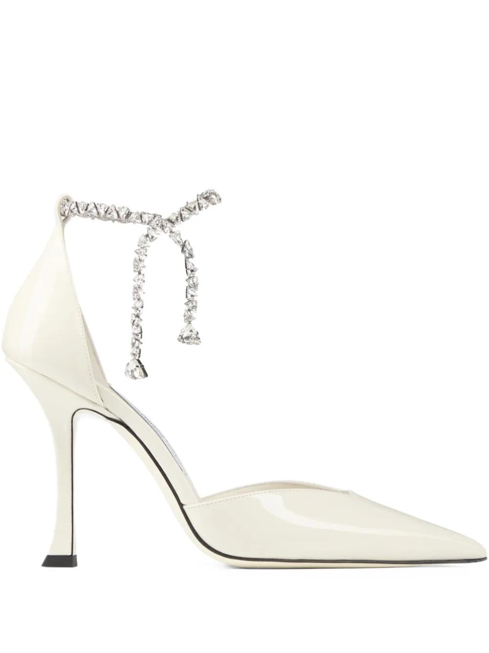 white patent leather crystal-embellished ankle strap pointed toe stiletto heel Wardrobe Icon