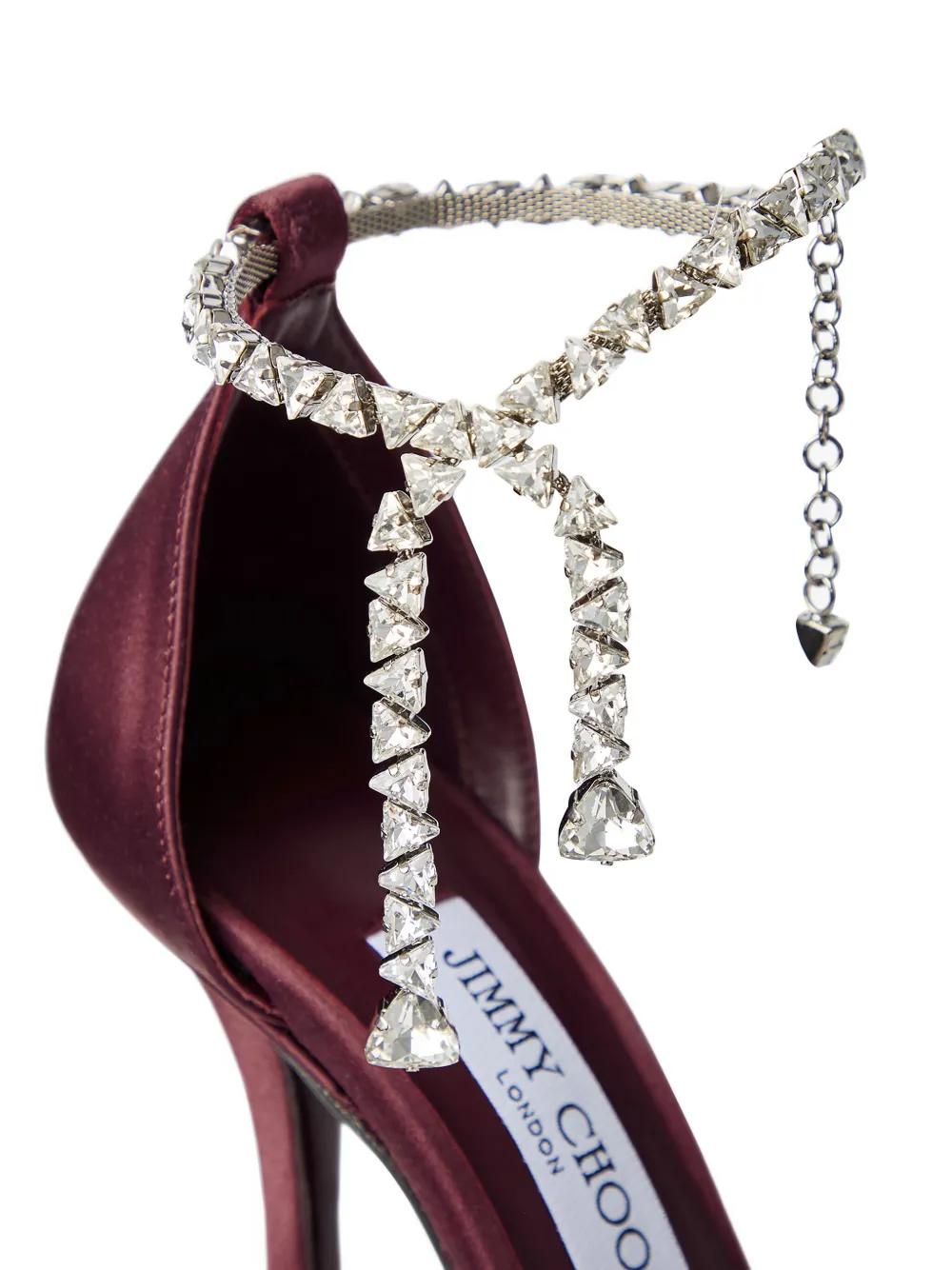 dark red satin upper crystal-embellished ankle strap pointed toe stiletto heel