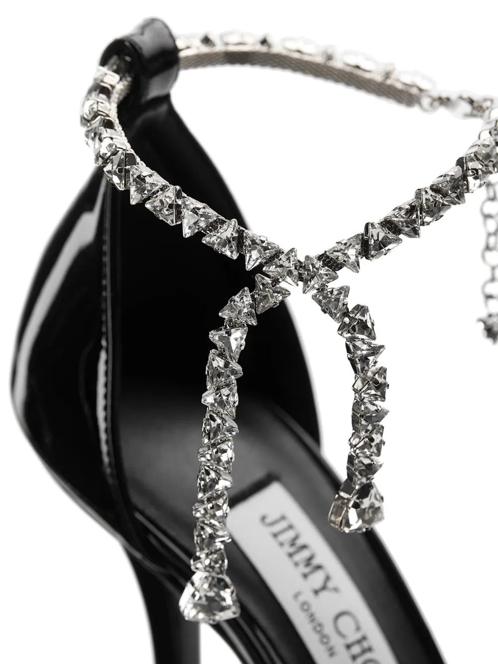 black calf leather patent finish side hook and eye fastening crystal-embellished ankle strap 100mm high sculpted heel pointed toe branded leather insole leather outsole Wardrobe Icon