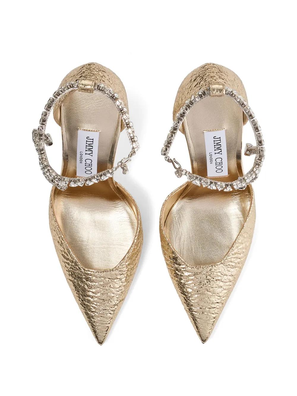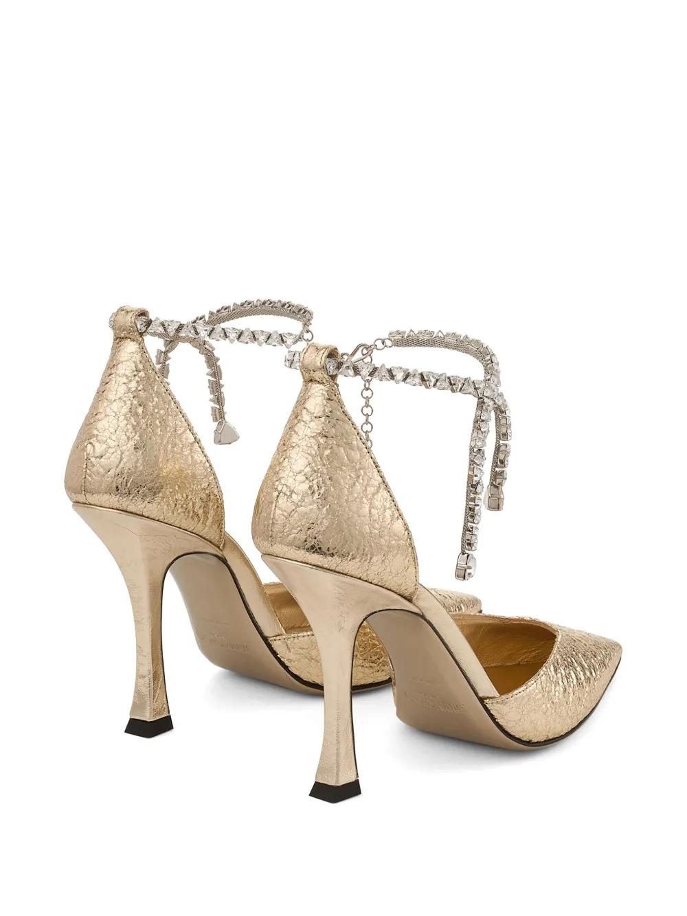 gold-tone goatskin crinkled finish metallic effect side hook and eye fastening crystal-embellished ankle strap 100mm high heel pointed toe branded leather insole leather outsole Wardrobe Icon