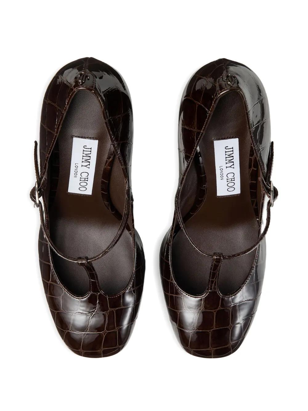 brown crocodile embossed effect t-strap platform sole 120mm heel buckle fastening