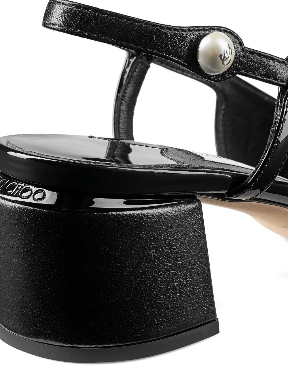 black patent-leather upper sling-back strap pearl embellishment block heel