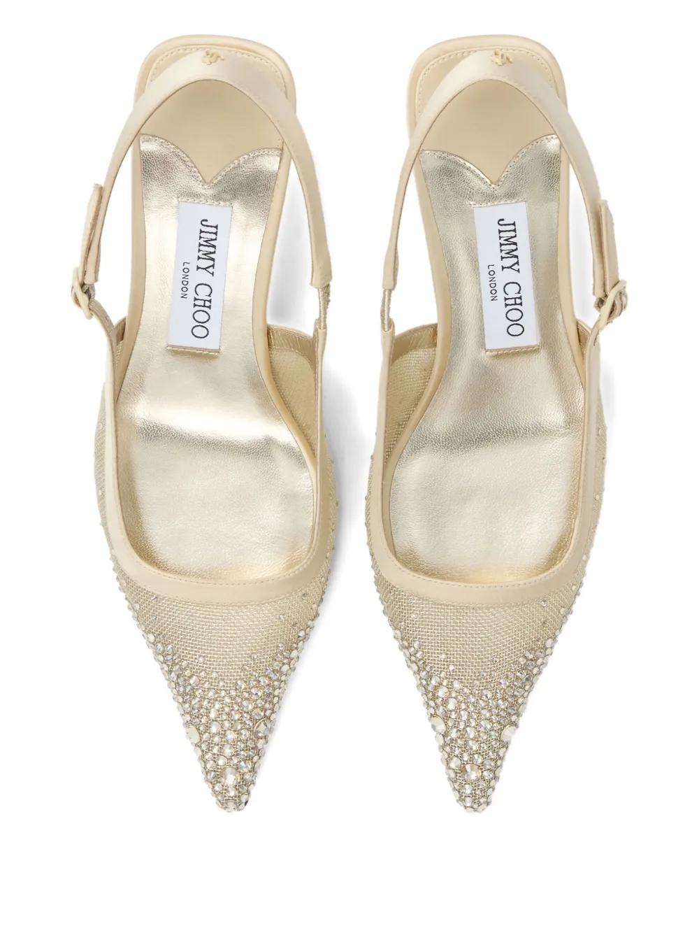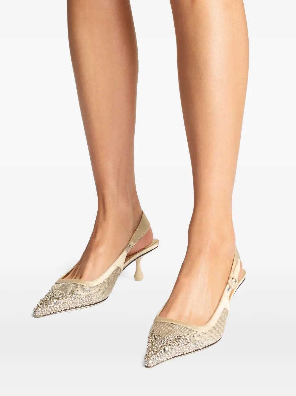 light gold-tone crystal embellishment slingback design pointed toe mesh fabric sculpted heel