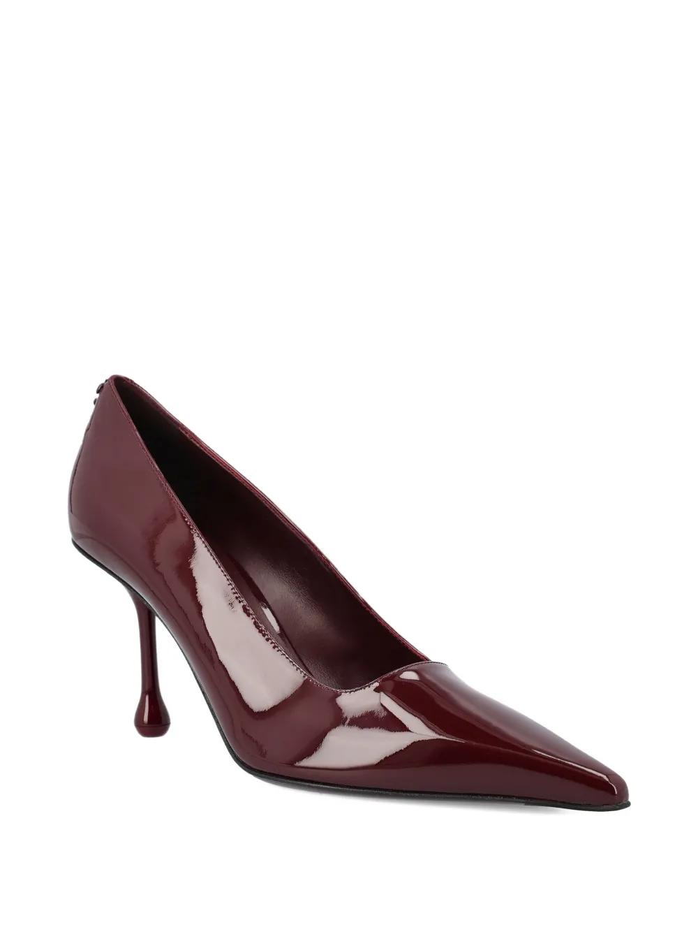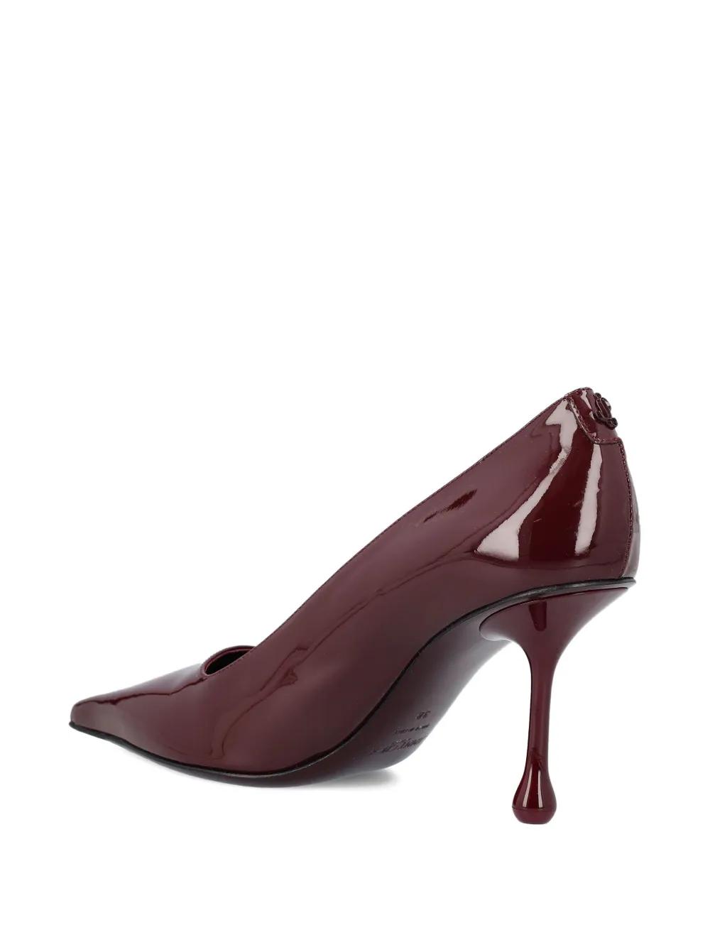 burgundy patent leather pointed toe stiletto heel curved heel back logo plaque