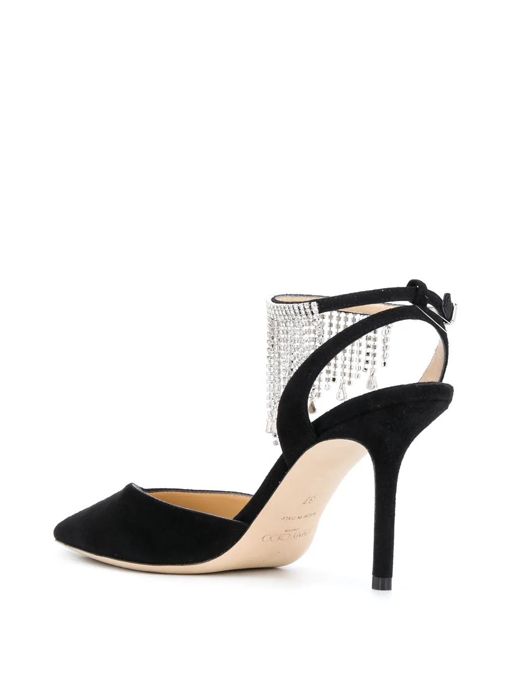 black suede crystal embellishment pointed toe side buckle fastening high heel branded insole