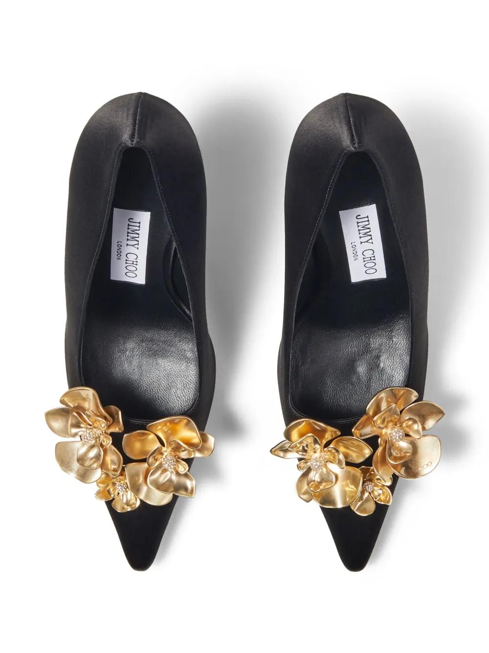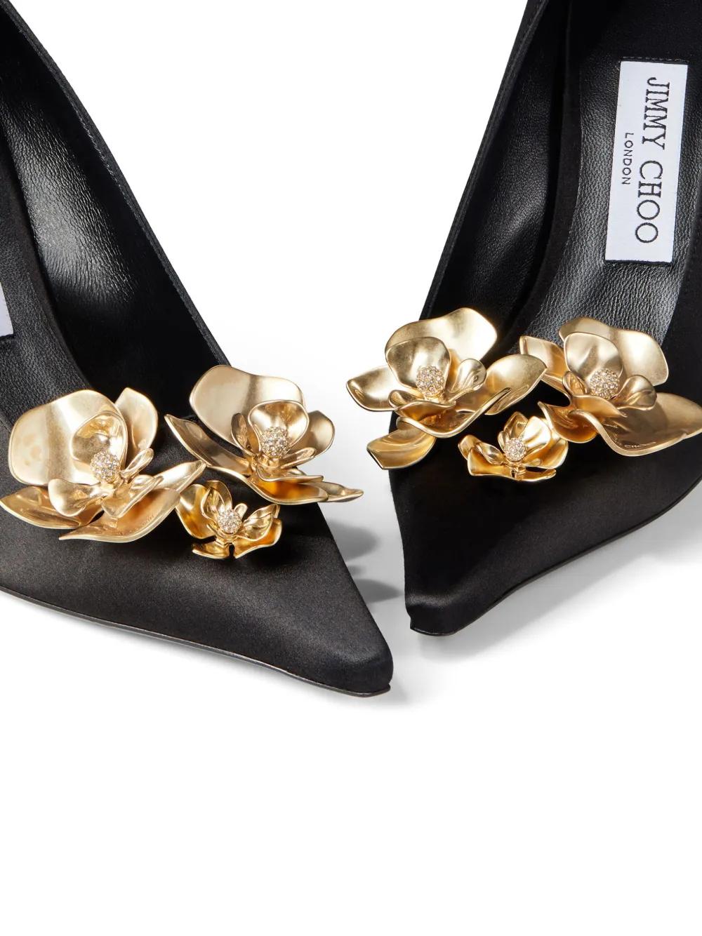 black/gold-tone lambskin faux-flower detailing slip-on style pointed toe branded insole 95mm high heel