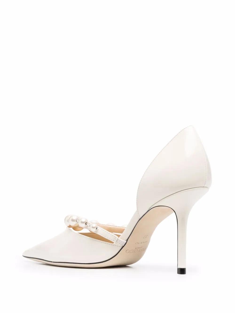 white leather faux-pearl embellishment pointed toe high-shine finish slip-on style 85mm stiletto heel