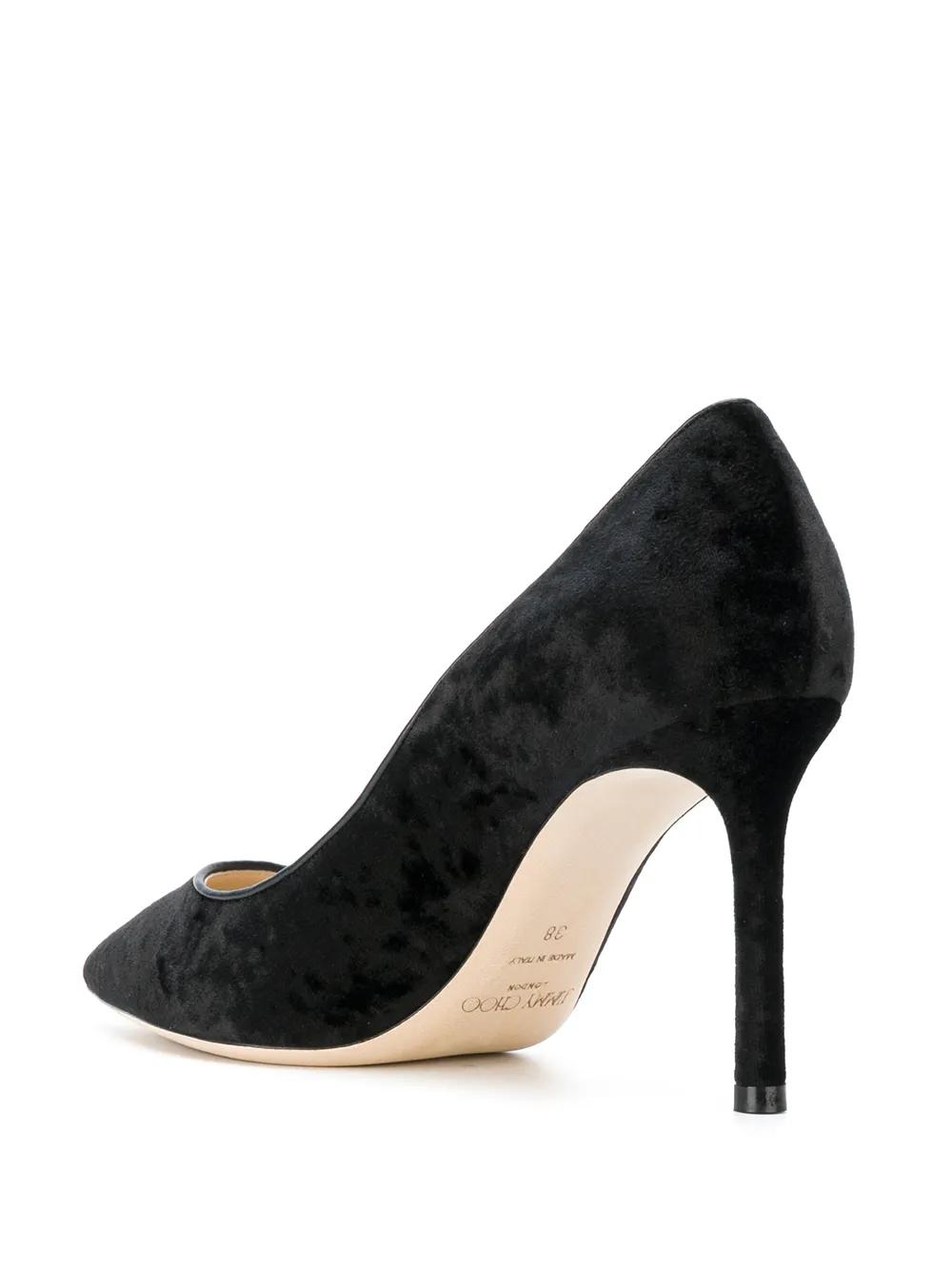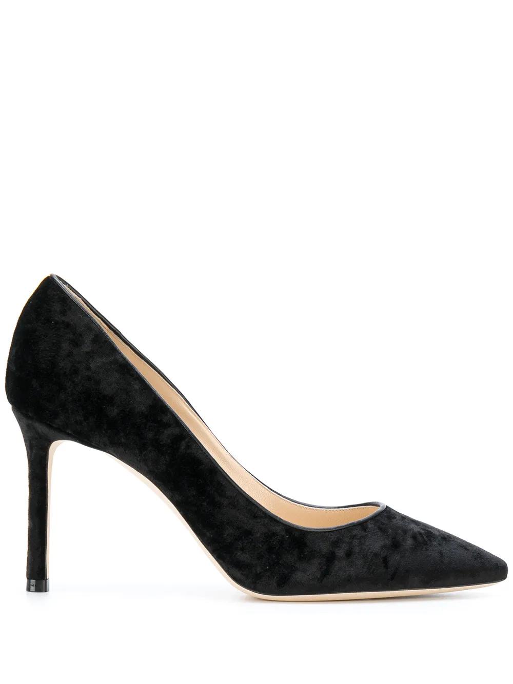 Black leather velvet stiletto pumps from Jimmy Choo featuring a high stiletto heel.
