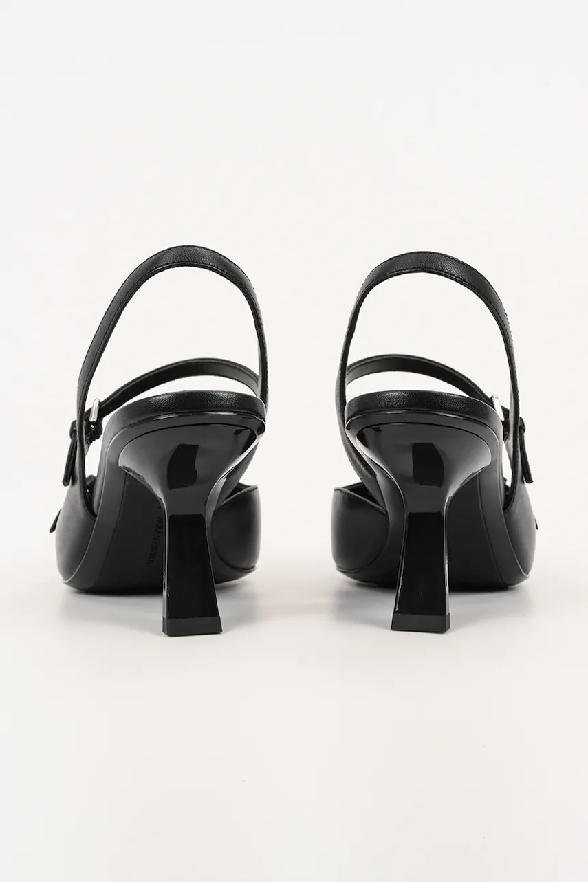 - Model z odkrytą piętą. - Model na obcasie typu szpilka. - Spiczasty, lekko usztywniony nosek. - Zapięcie na klamry ze szpilką, które umożliwiają indywidualne dopasowanie. - Skórzana wkładka jest komfortowa dla stopy i zapobiega odparzeniom, otarciom oraz pojawianiu się nieprzyjemnego zapachu.