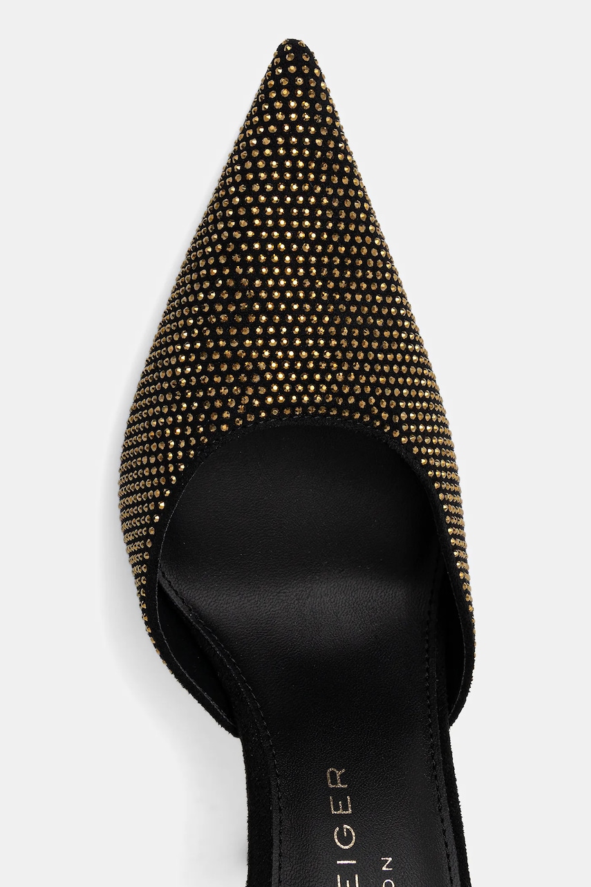 - Spiczasty, usztywniony nosek. - Model z odkrytą piętą. - Gumowa podeszwa zewnętrzna jest wytrzymała i odporna na uszkodzenia. - Model na obcasie typu szpilka. - Profilowana wkładka wspiera łuk stopy i zapewnia długotrwały komfort noszenia. - Zapięcie na klamrę ze szpilką, które umożliwia indywidualne dopasowanie. - Wysokość obcasa: 10,5 cm.