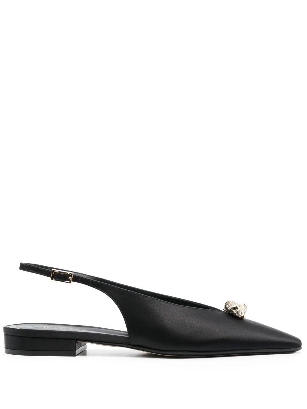 black calf leather decorative plaque pointed toe buckle-fastening slingback strap flat sole