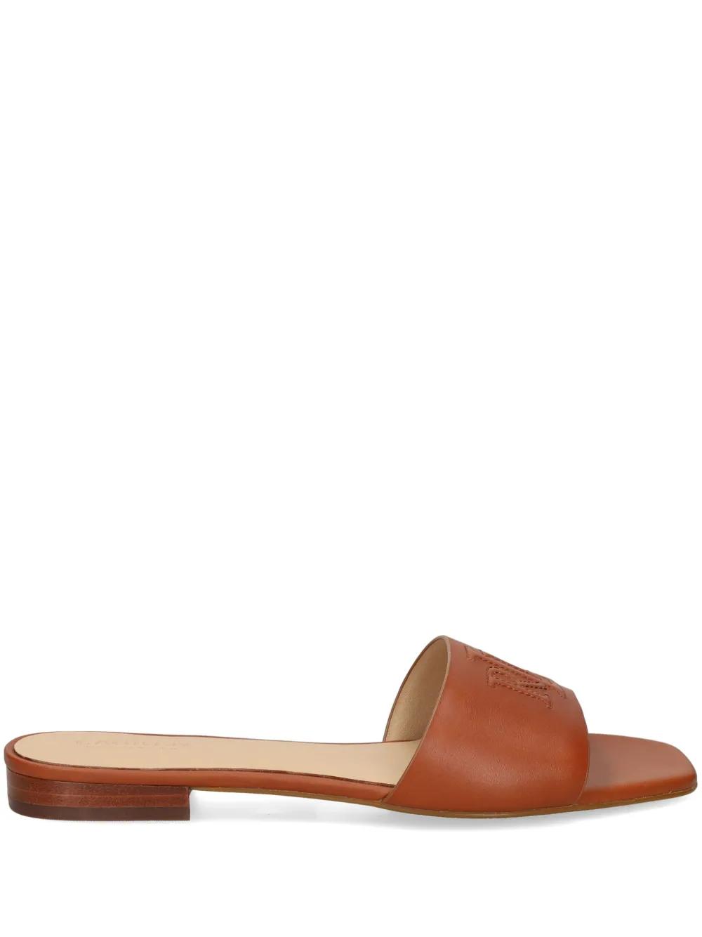 camel brown slip-on style logo-embossed strap single toe strap branded insole