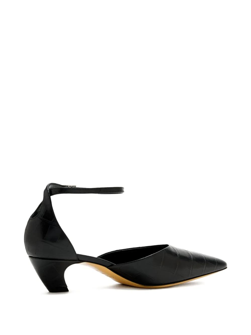 black crocodile-effect leather ankle strap buckle fastening pointed toe sculpted heel