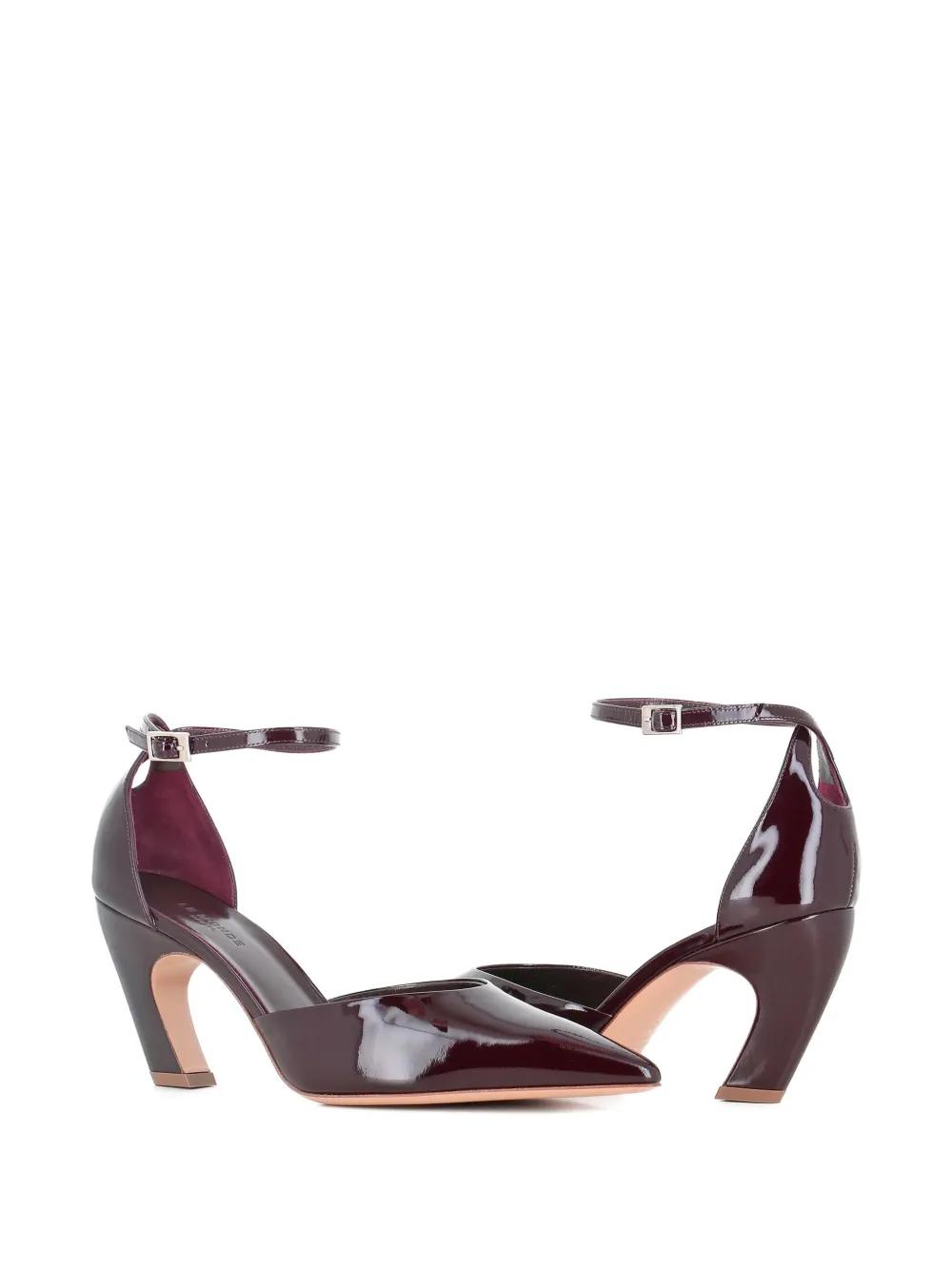 red patent finish ankle strap pointed toe sculpted heel buckle fastening