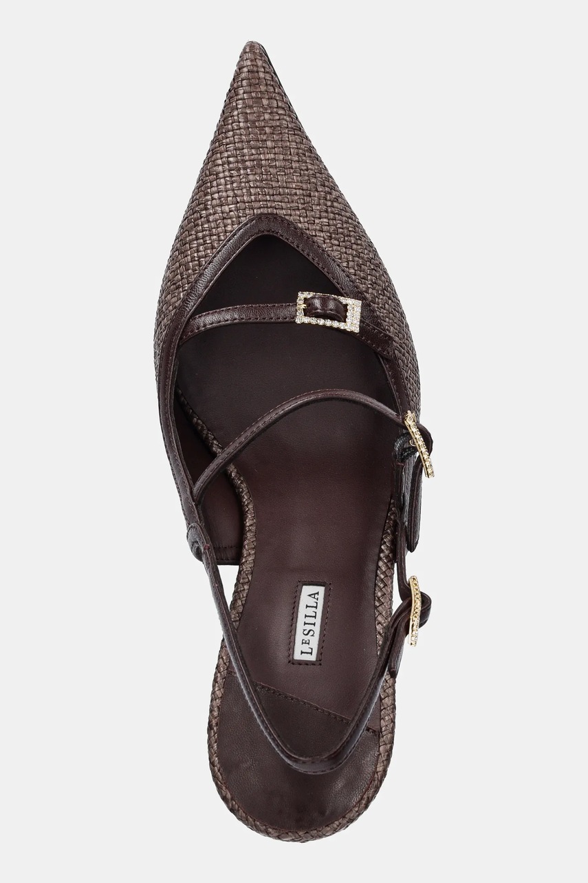 - W całości wykonane ręcznie. - Zapięcie na klamry ze szpilką, które umożliwiają indywidualne dopasowanie. - Spiczasty, usztywniony nosek. - Model z odkrytą piętą. - Skórzana wkładka jest komfortowa dla stopy i zapobiega odparzeniom, otarciom oraz pojawianiu się nieprzyjemnego zapachu. - Model na obcasie typu szpilka. - Dołączony tekstylny worek zabezpiecza produkt przed kurzem. - Wysokość obcasa: 10 cm.