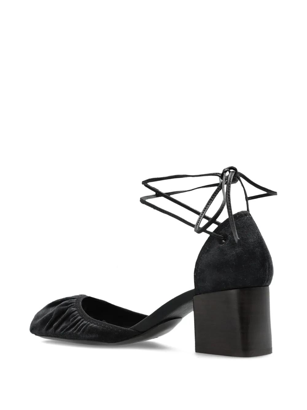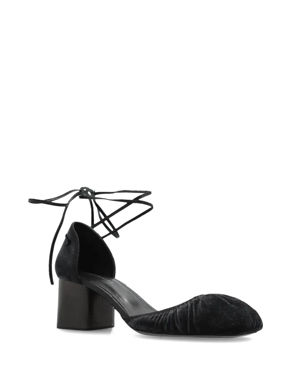 black suede upper gathered toe block heel lace-up ankle fastening