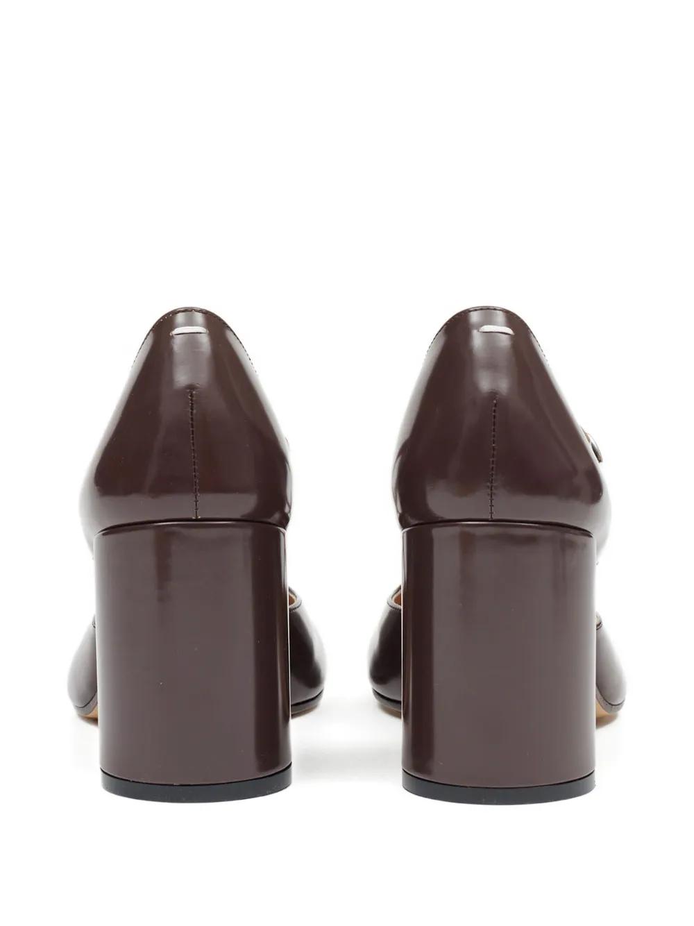 chocolate brown side buckle fastening high block heel branded insole crossover strap detail