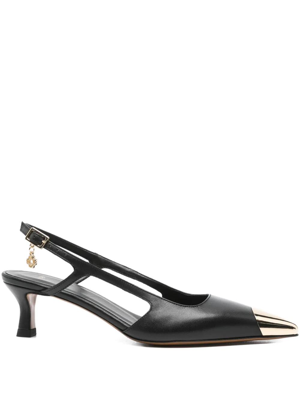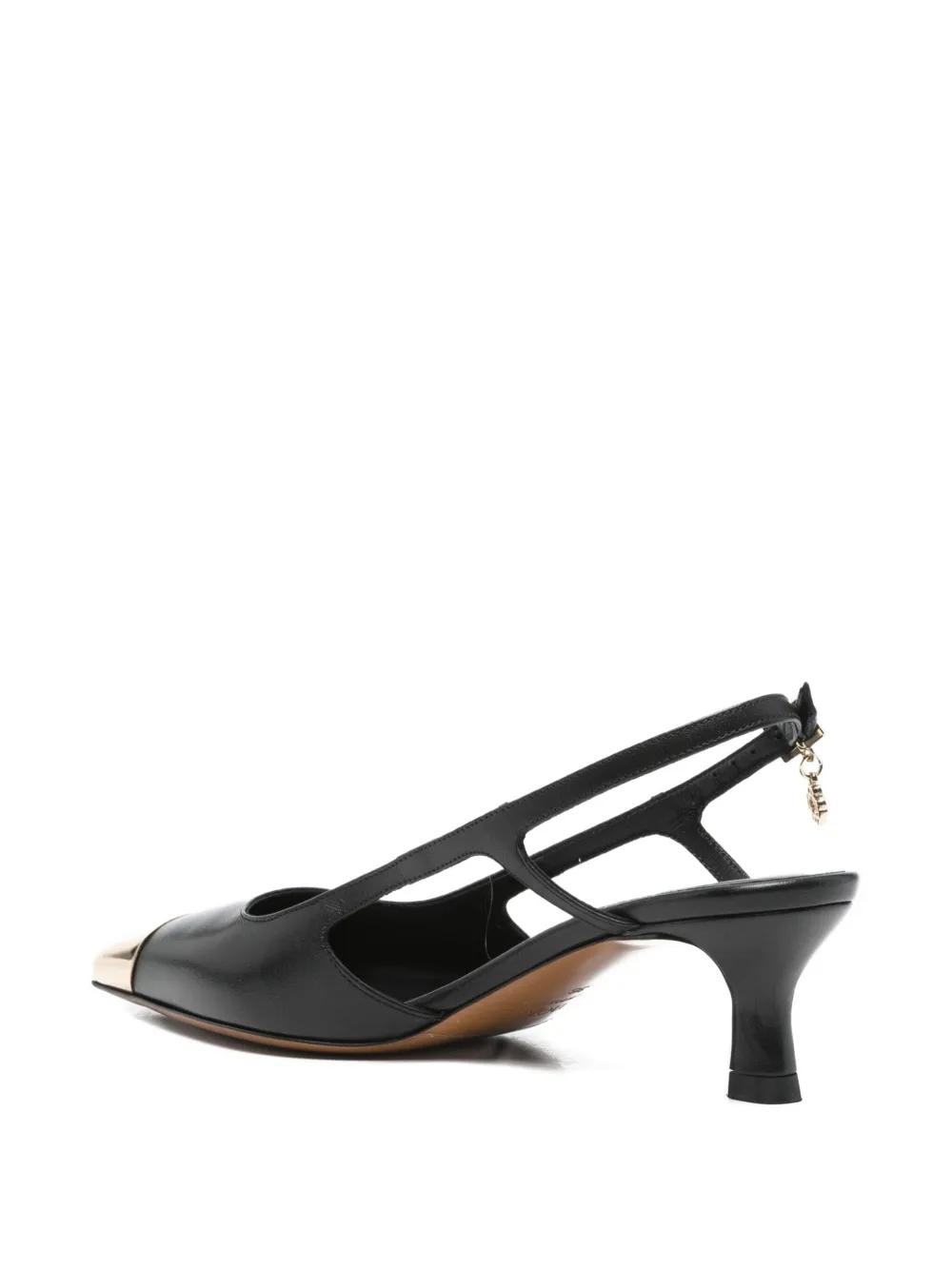 black leather upper slingback strap cut-out detail gold-tone cap toe kitten heel