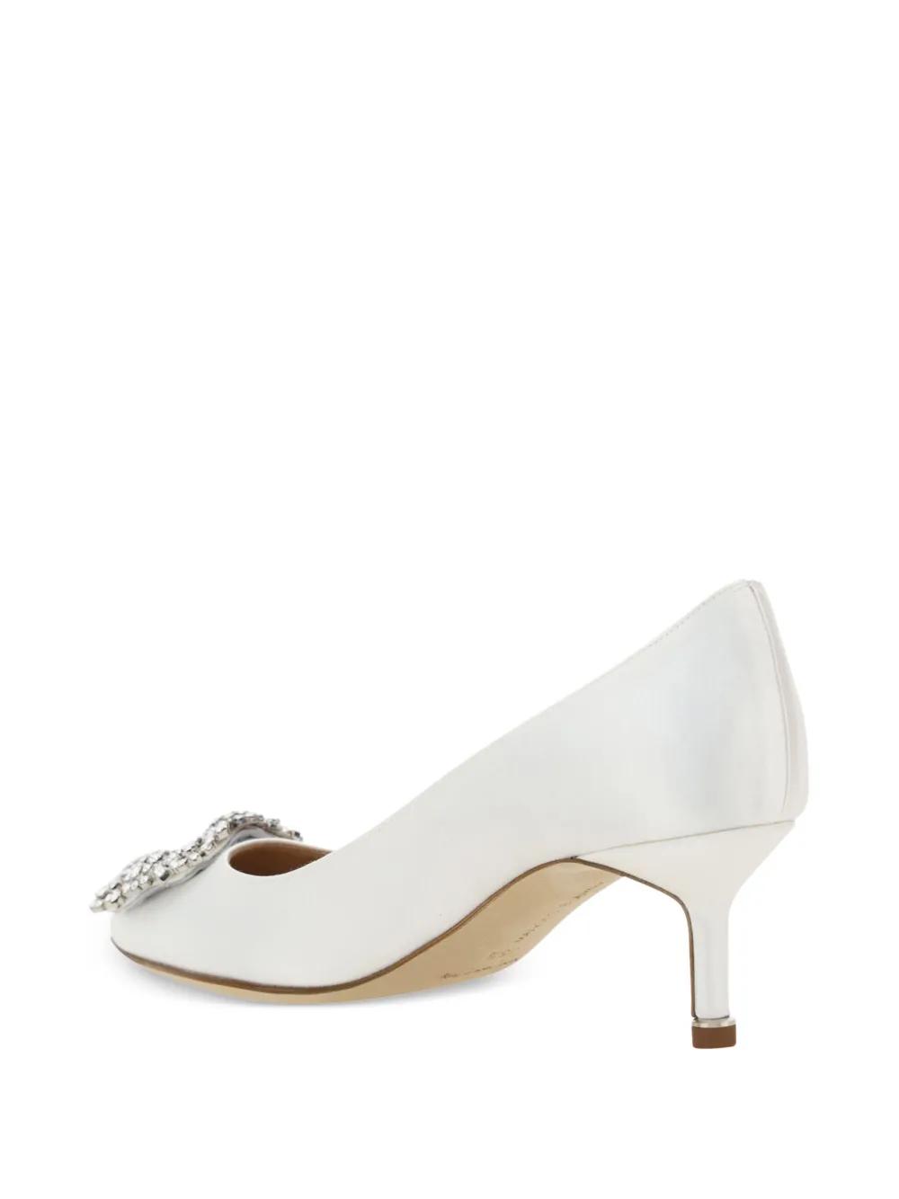 cream white silk satin slip-on style 50mm kitten heel crystal buckle detail almond toe branded leather insole leather outsole