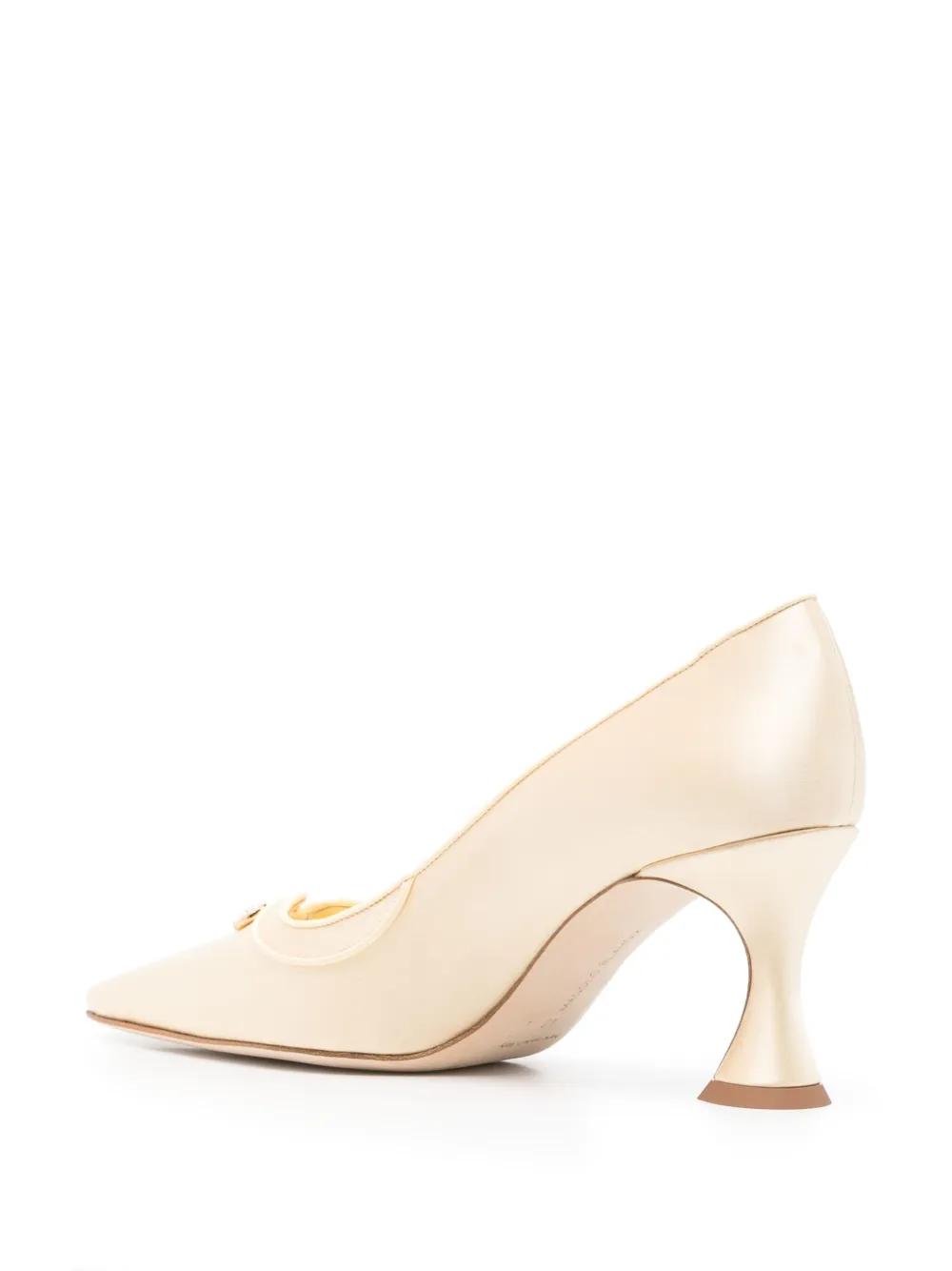 almond beige crystal embellishment pointed toe branded leather insole mid tapered heel