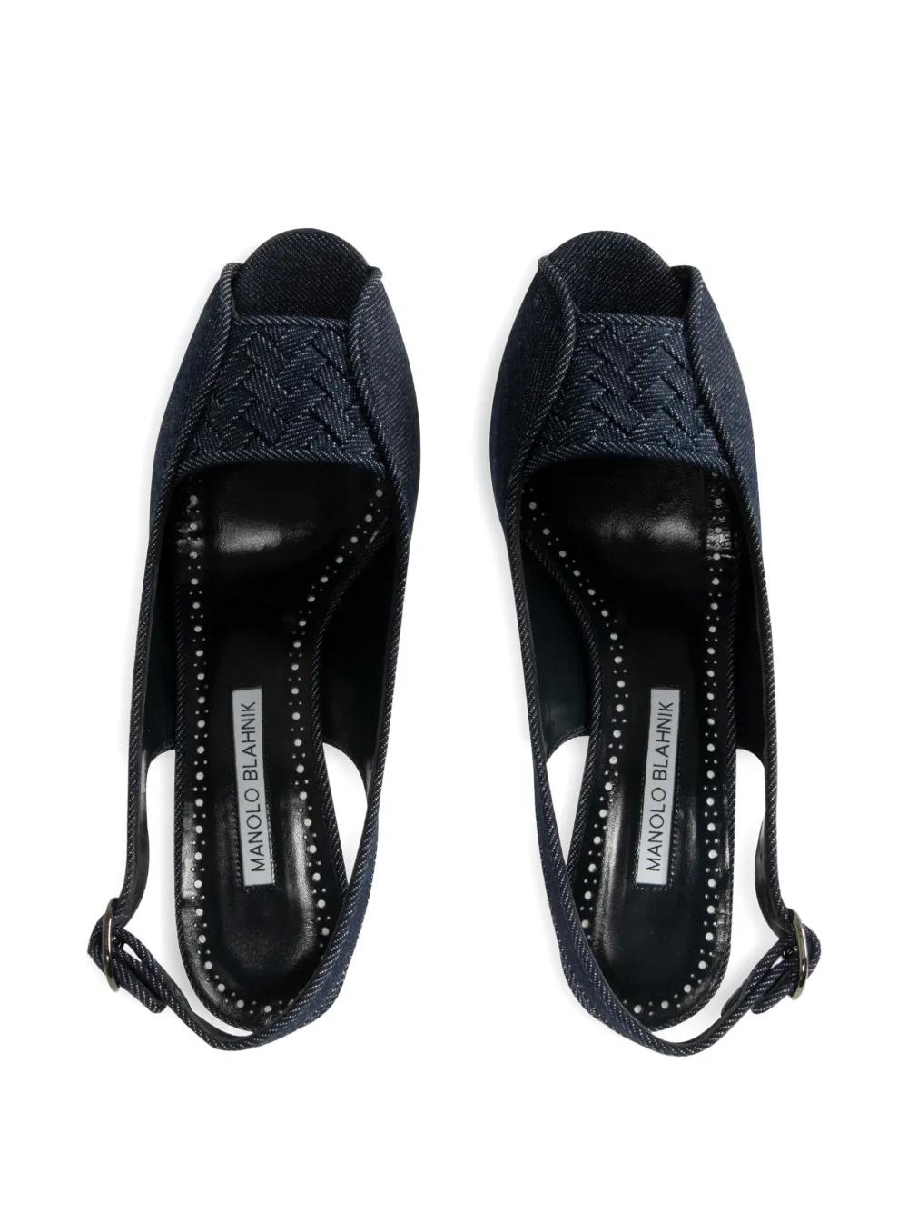 dark blue denim fabric slingback strap buckle fastening open toe woven detail
