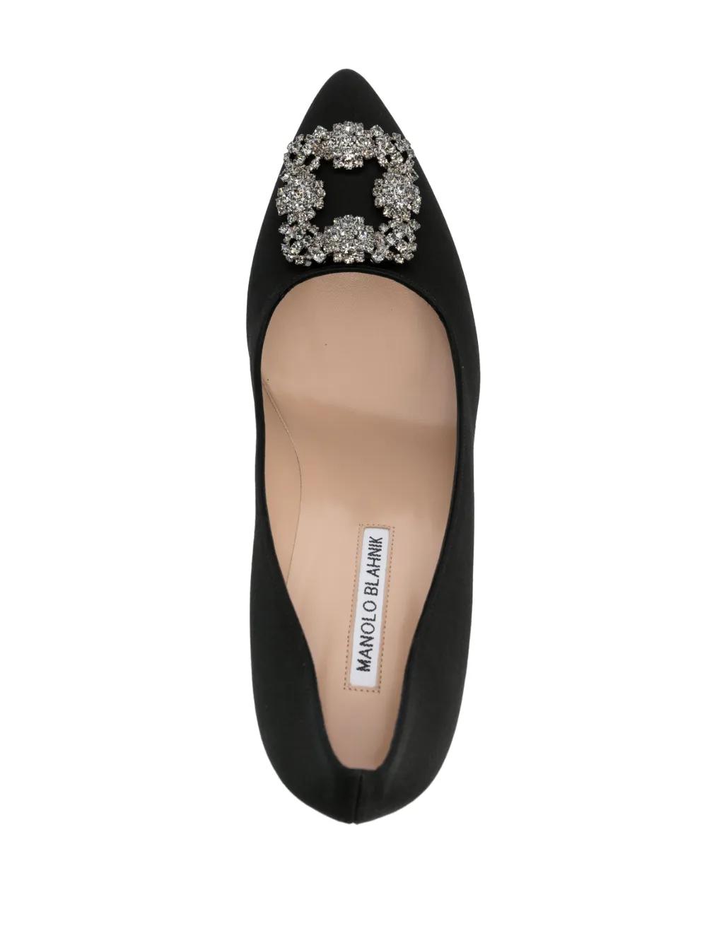black satin finish crystal buckle detail pointed toe branded leather insole high stiletto heel leather sole