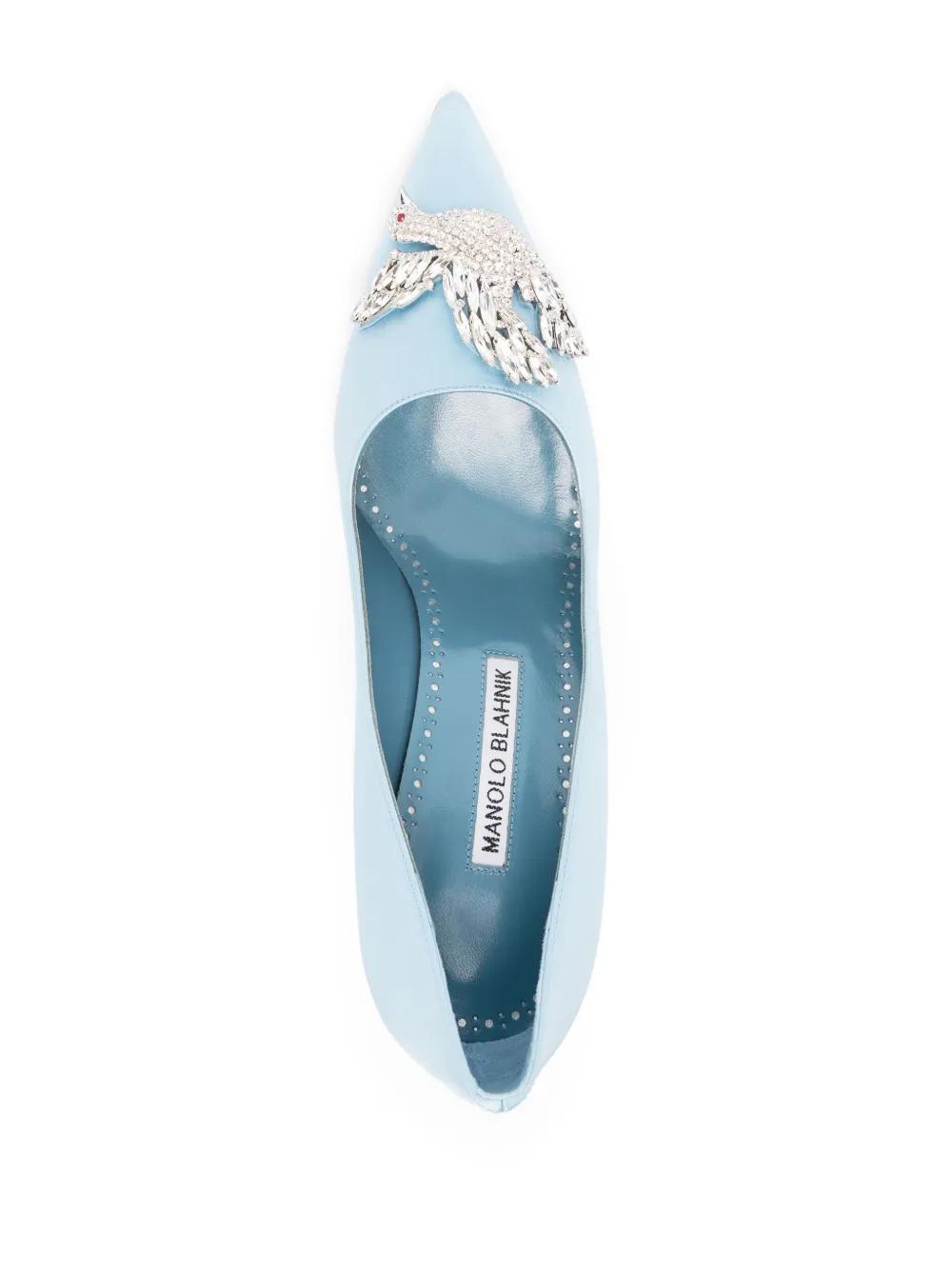 sky blue satin finish pointed toe crystal embellishment bird motif branded leather insole leather lining high stiletto heel leather sole slip-on style