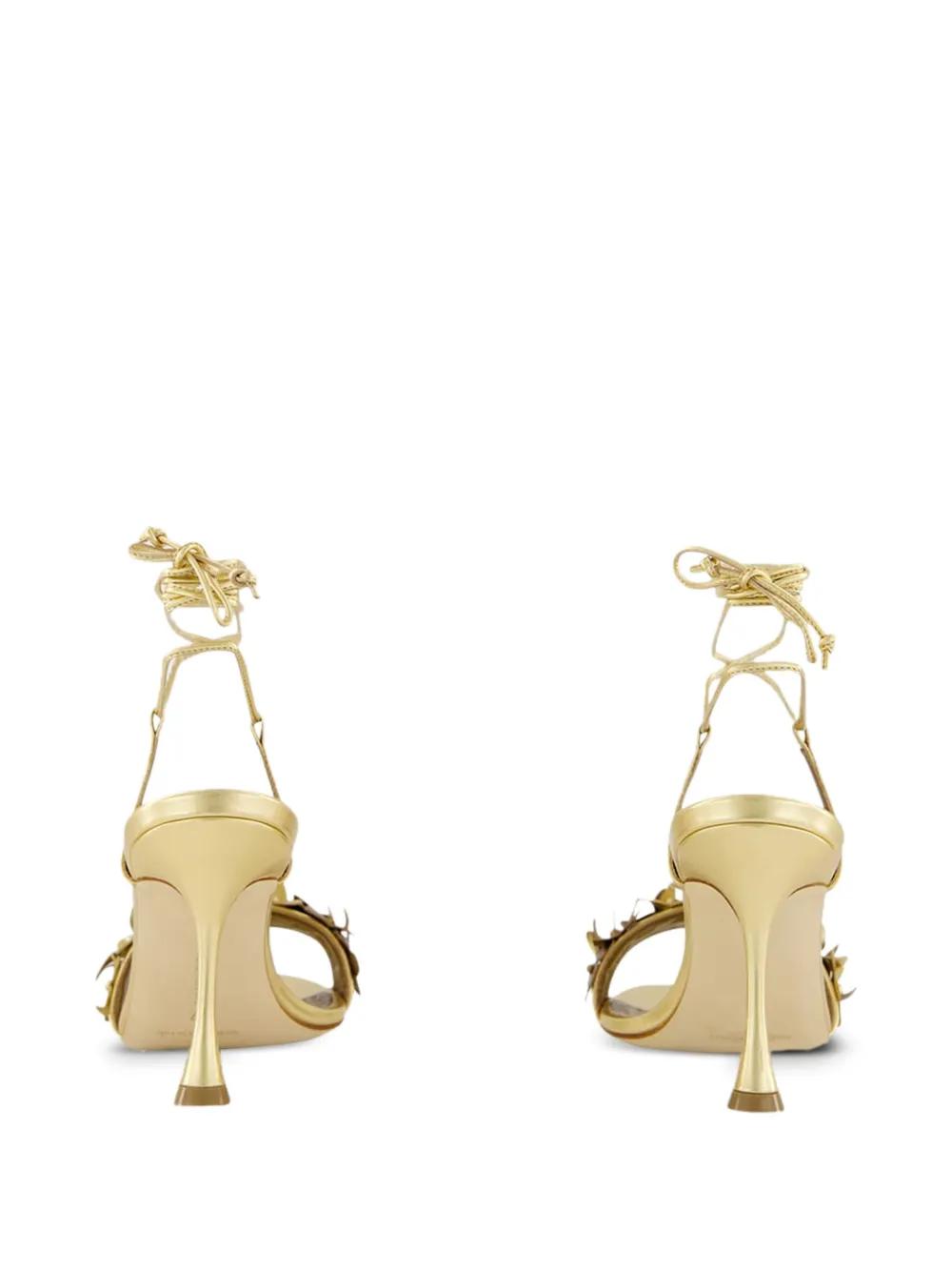 gold leather upper flower embellishments high heel lace-up ankle fastening open toe