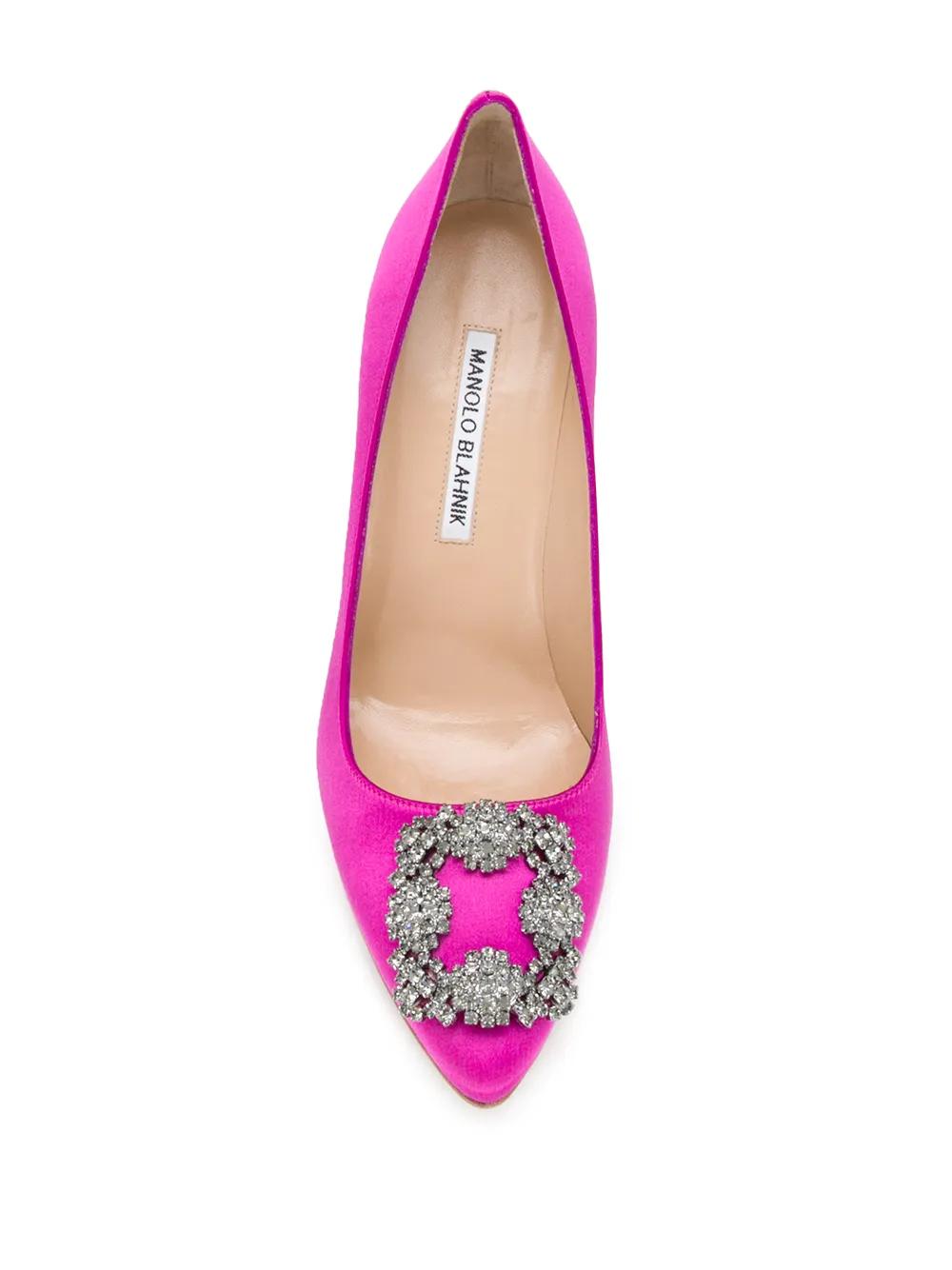 fuschia pink crystal buckle detail pointed toe slip-on style branded insole high heel