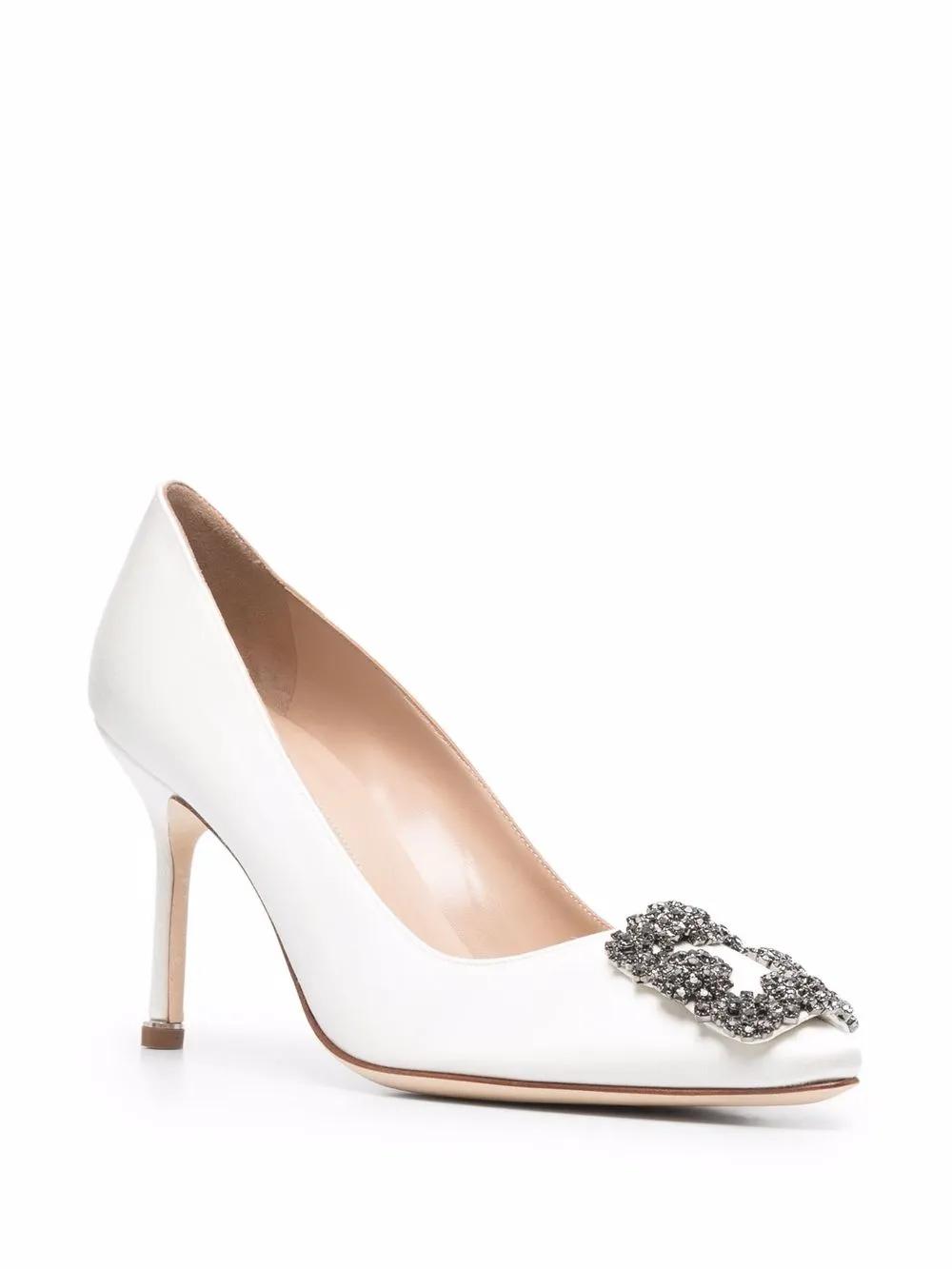 cream white leather crystal embellishment decorative buckle detail pointed toe slip-on style branded insole high heel