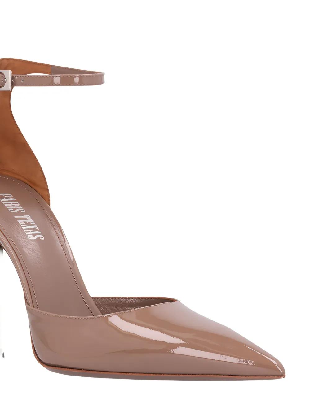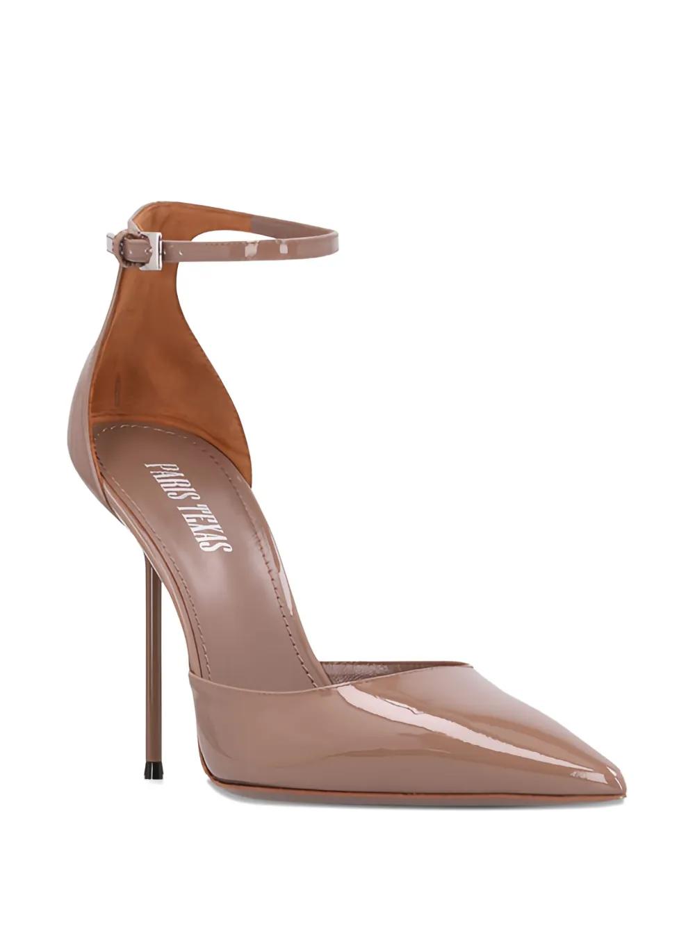 taupe patent leather stiletto heel ankle strap buckle fastening pointed toe