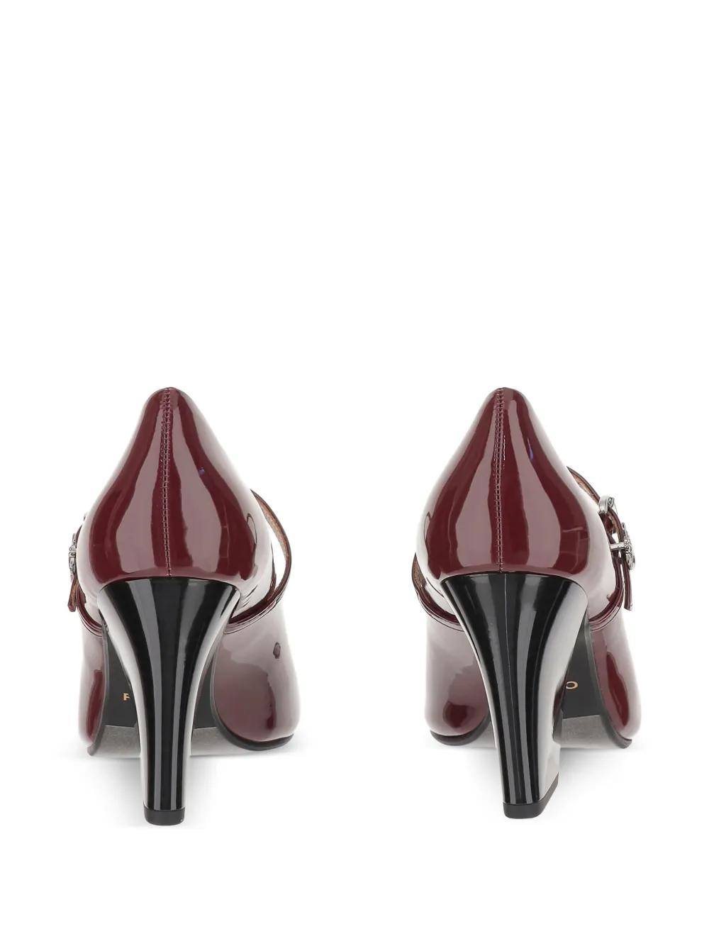 burgundy patent leather finish ankle strap buckle fastening block heel pointed toe
